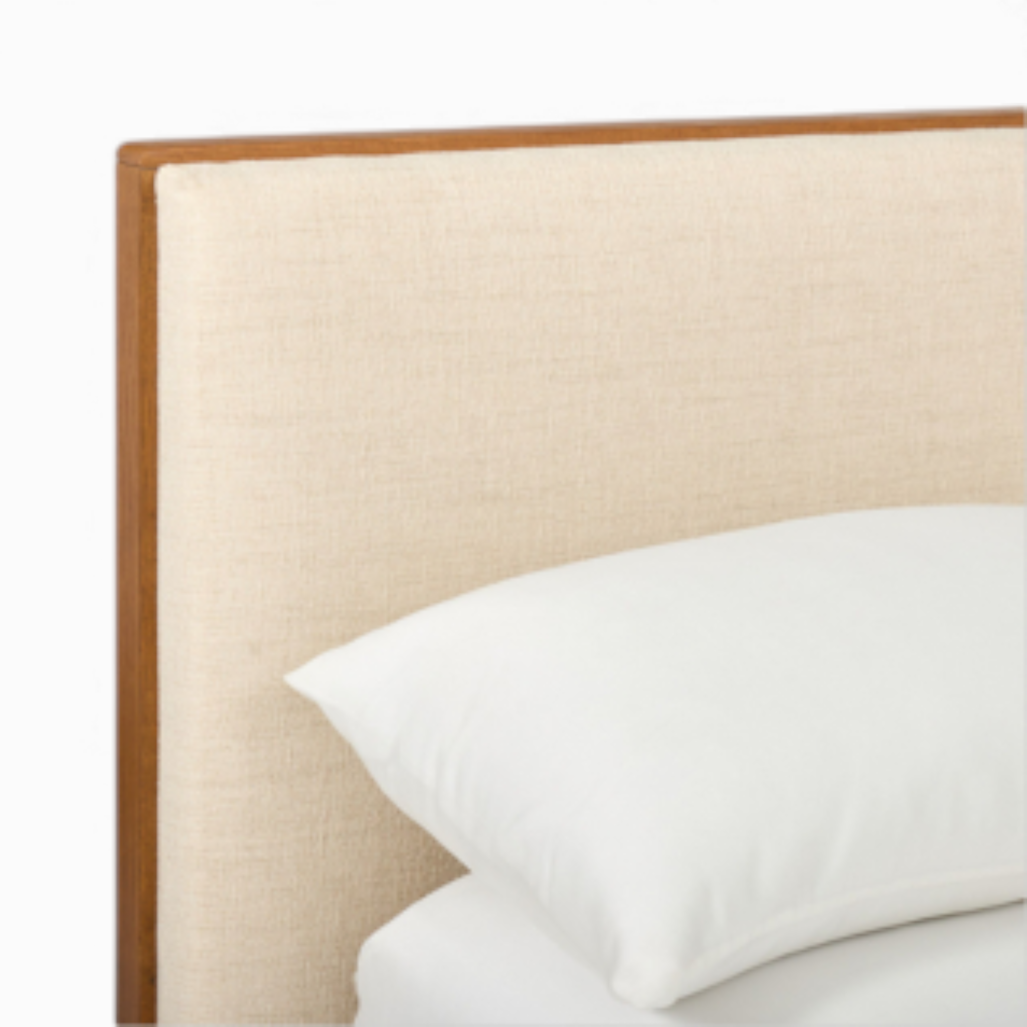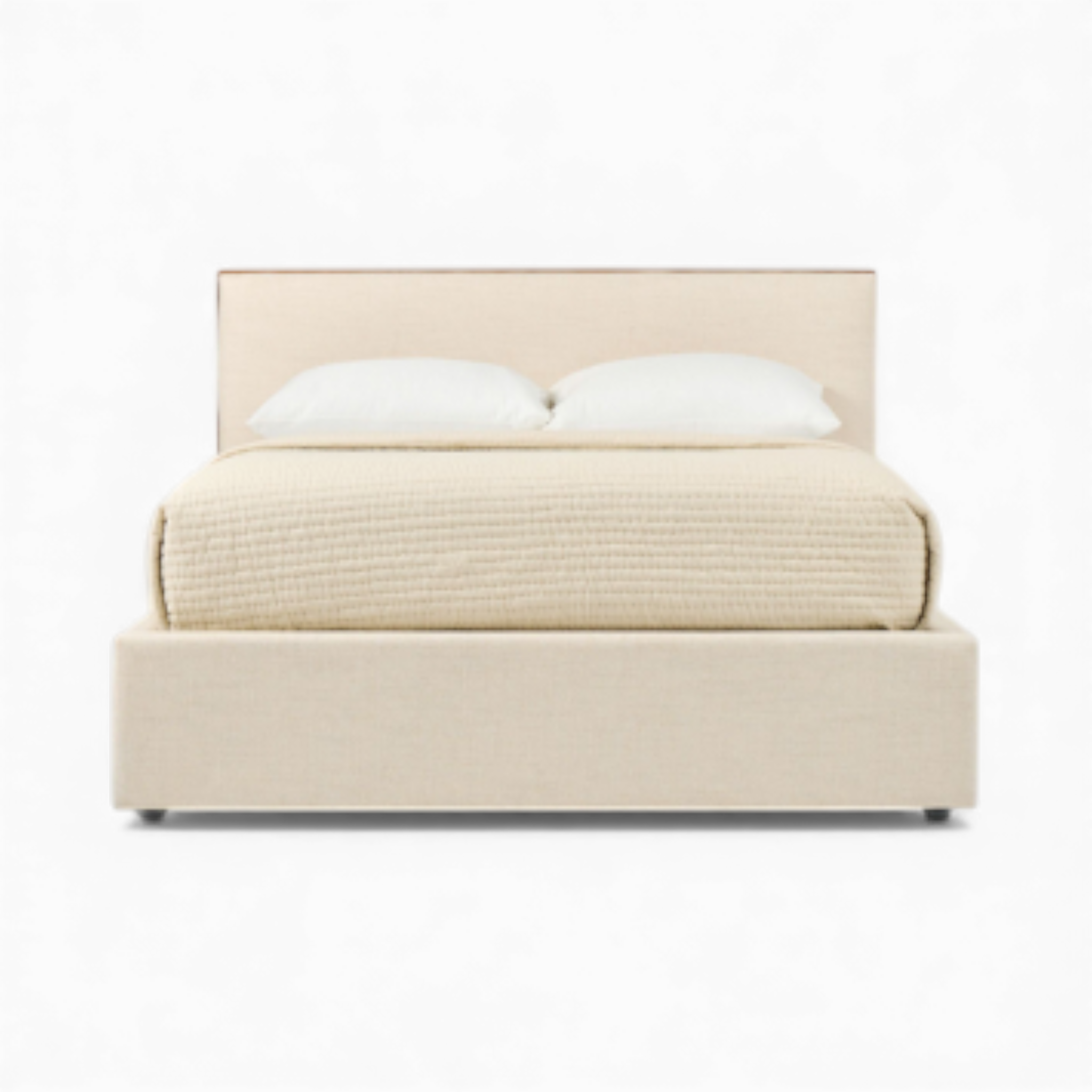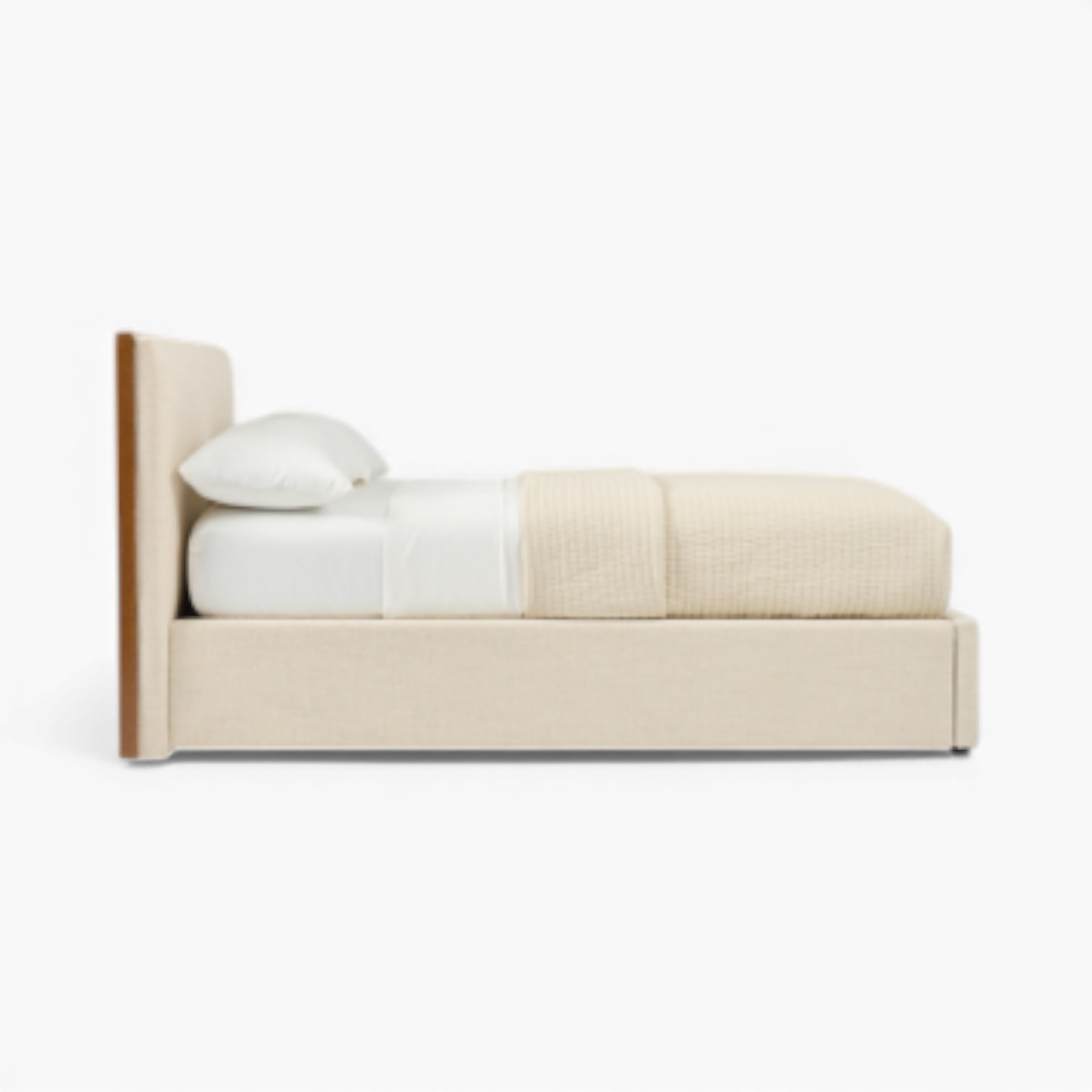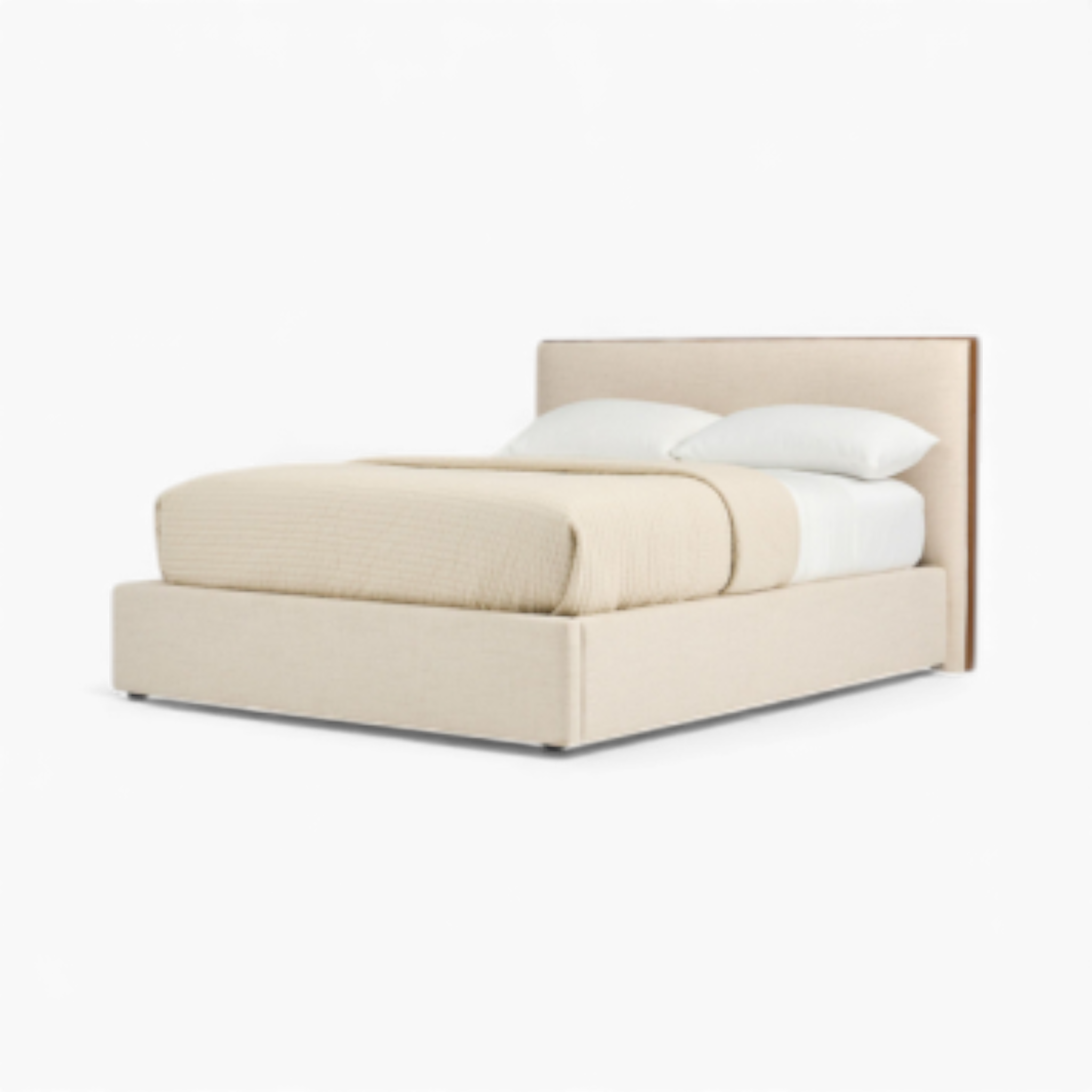 Introduce effortless style and serenity to your space with the Bologna Bed Frame. This elegant upholstered platform bed features a clean, low-profile silhouette fully wrapped in a soft, neutral linen-blend fabric (beige/oatmeal). The thin, contemporary headboard is accented by a subtle, exposed natural wood trim on the sides, adding a sophisticated, modern contrast. The Bologna Bed is the versatile foundation perfect for any transitional or minimalist bedroom design.