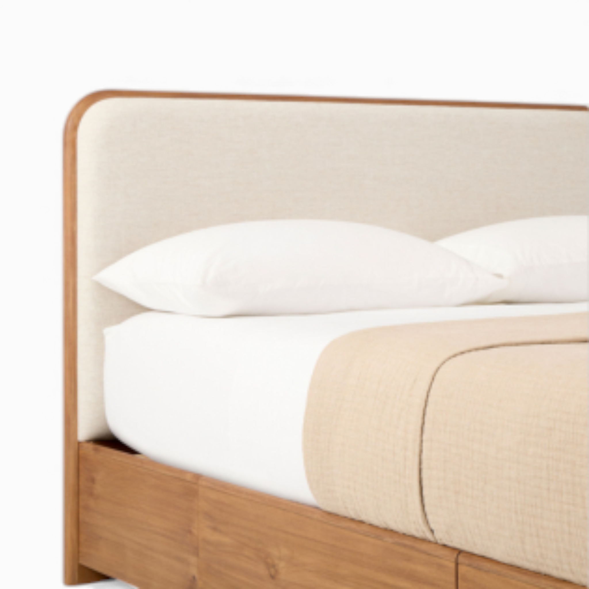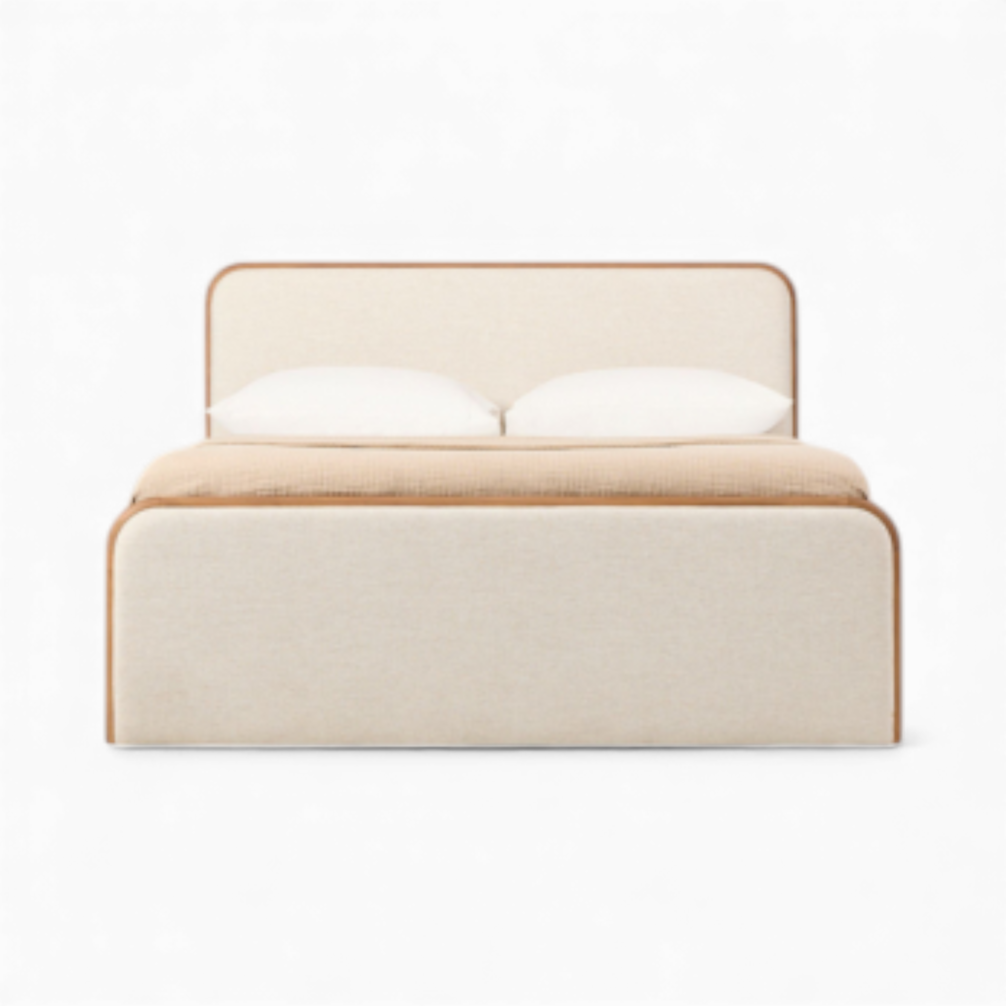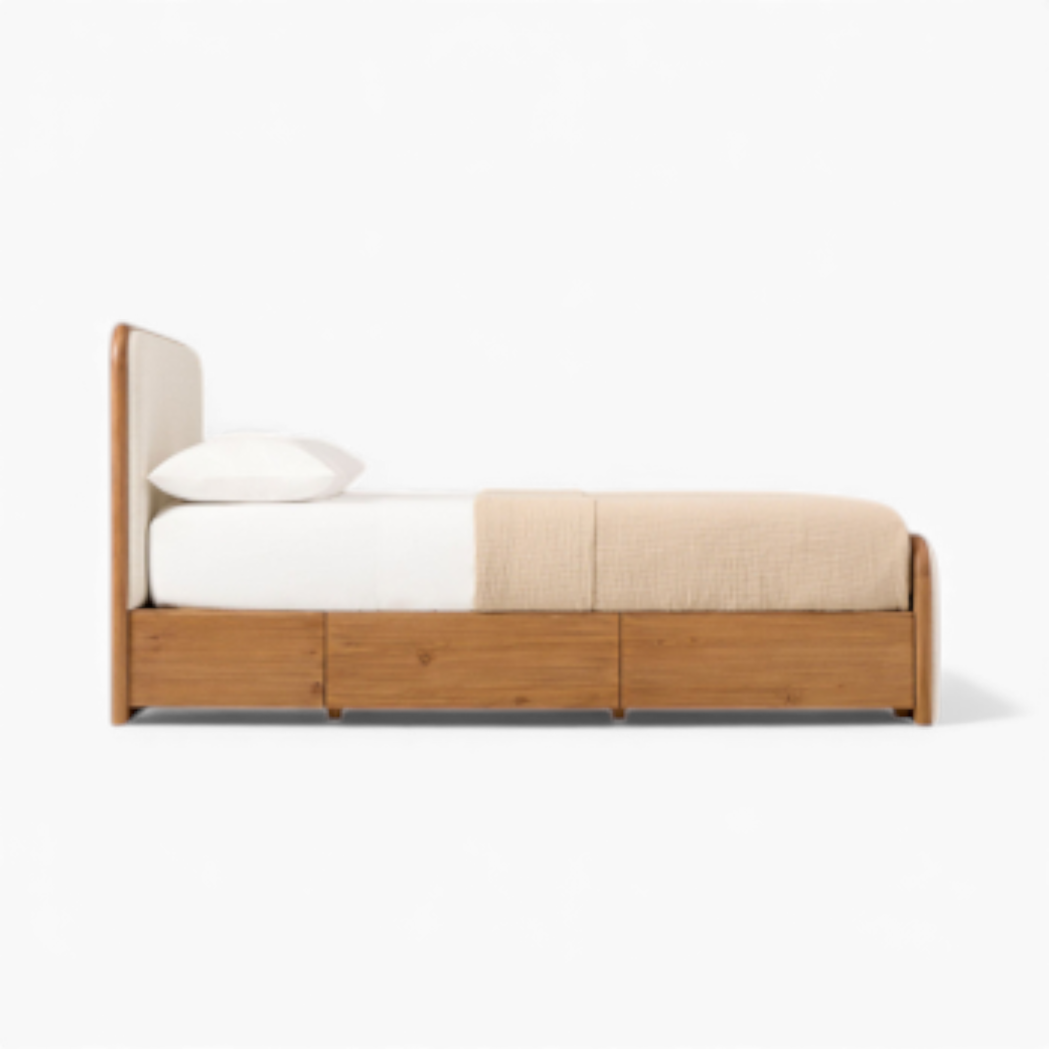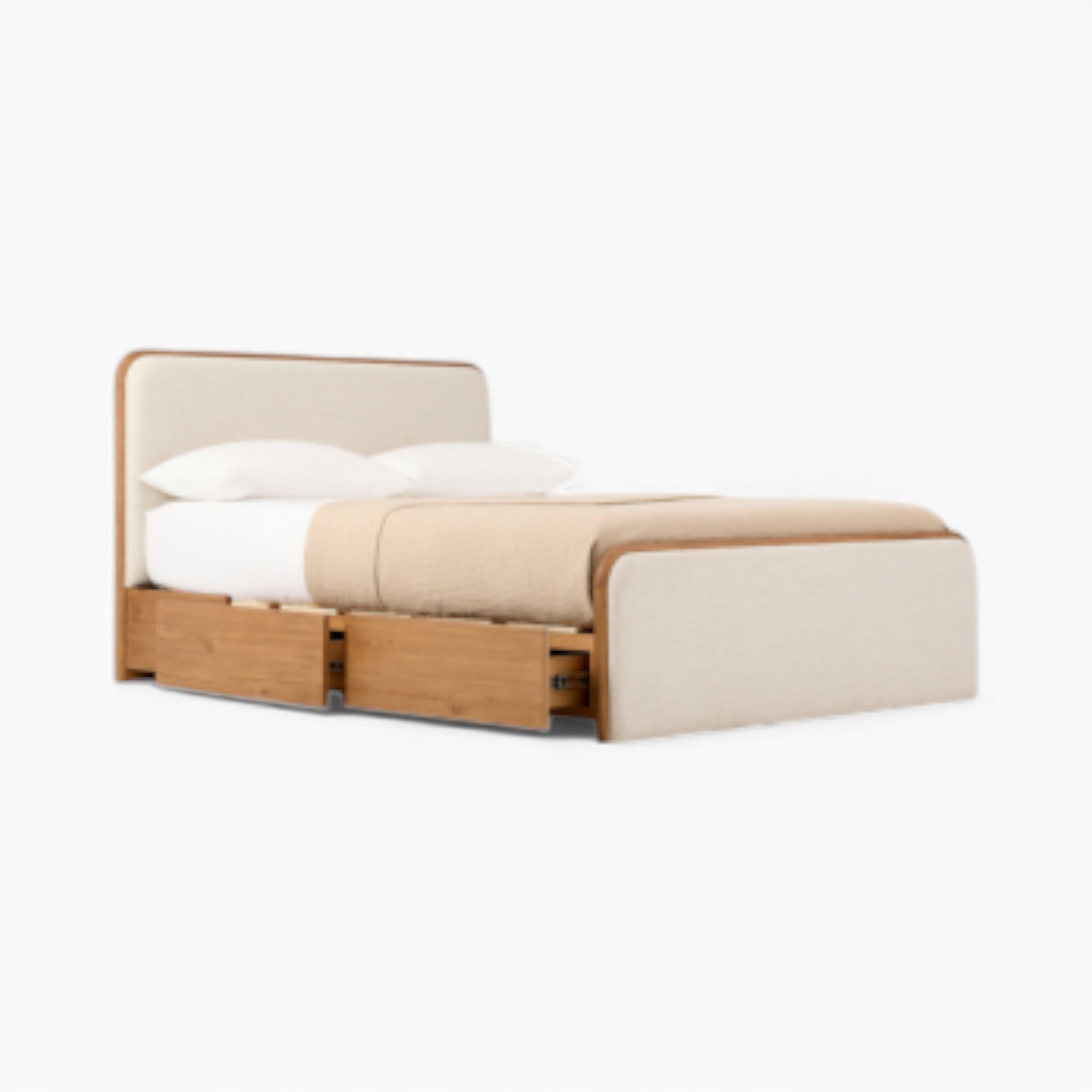Maximize your bedroom space without sacrificing style with the Caelus Storage Bed. This contemporary platform frame features soft, rounded corners and is fully wrapped in a calming neutral linen-blend upholstery. Its signature appeal lies in the integrated under-bed storage drawers, finished with contrasting natural light wood fronts (such as Oak or Ash). The Caelus perfectly blends the cozy look of an upholstered bed with the essential practicality of space-saving storage.