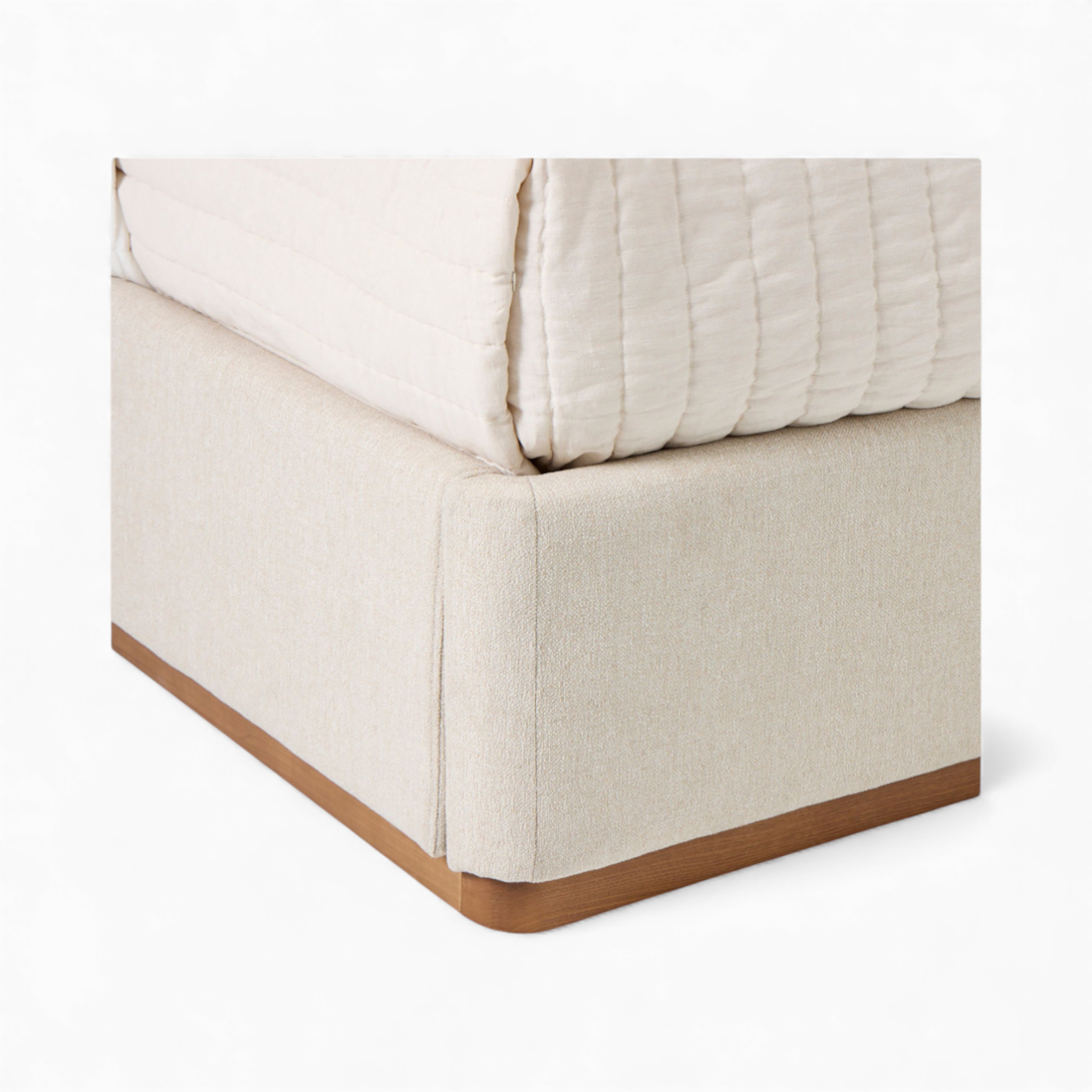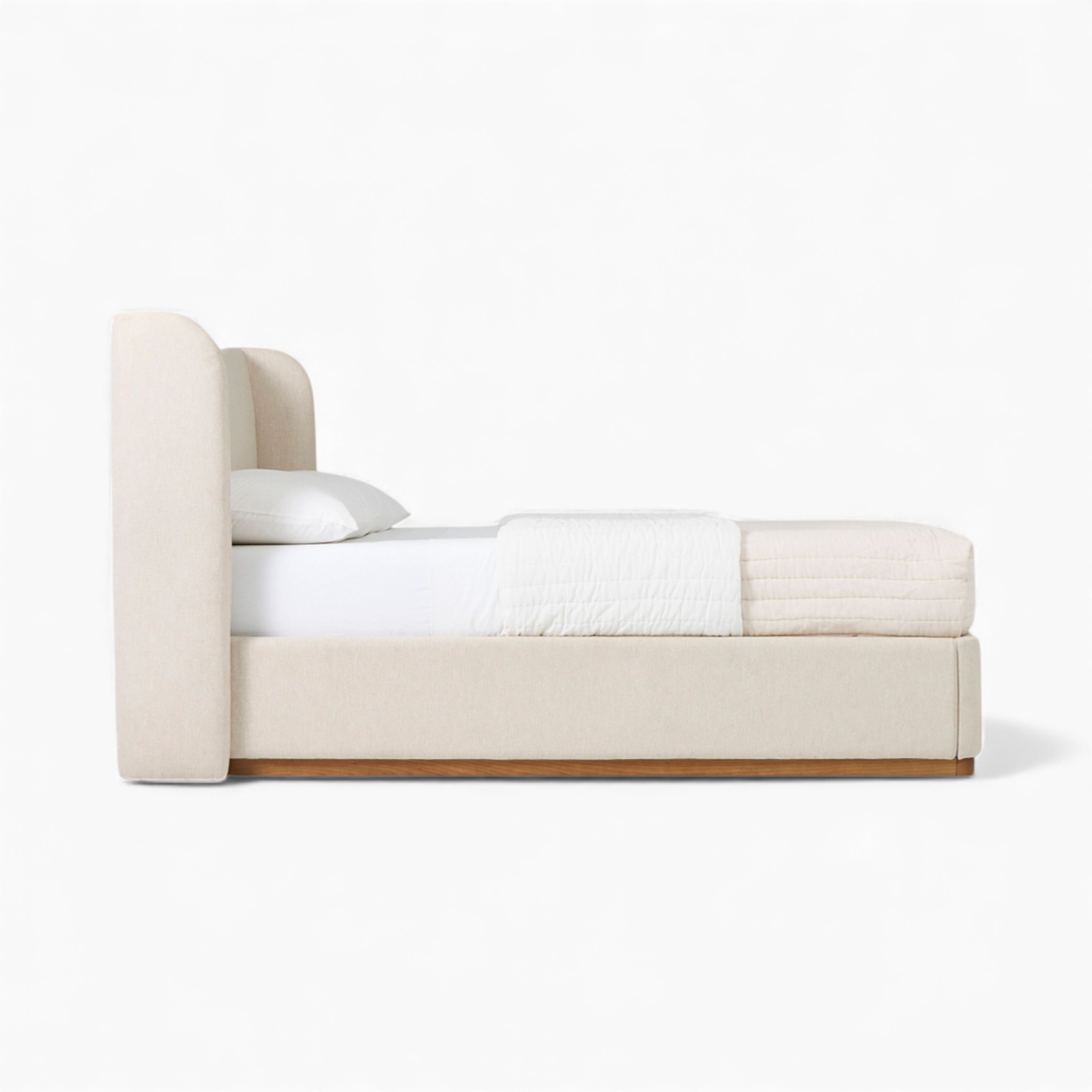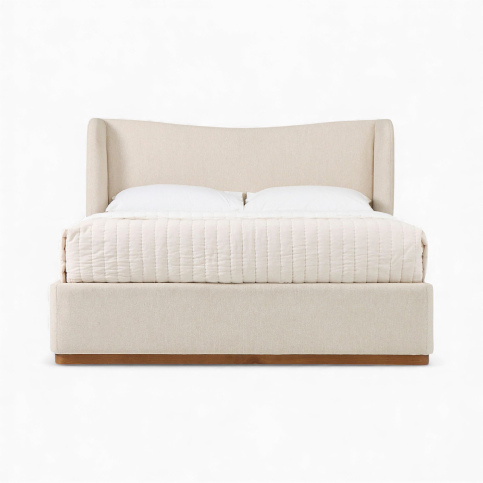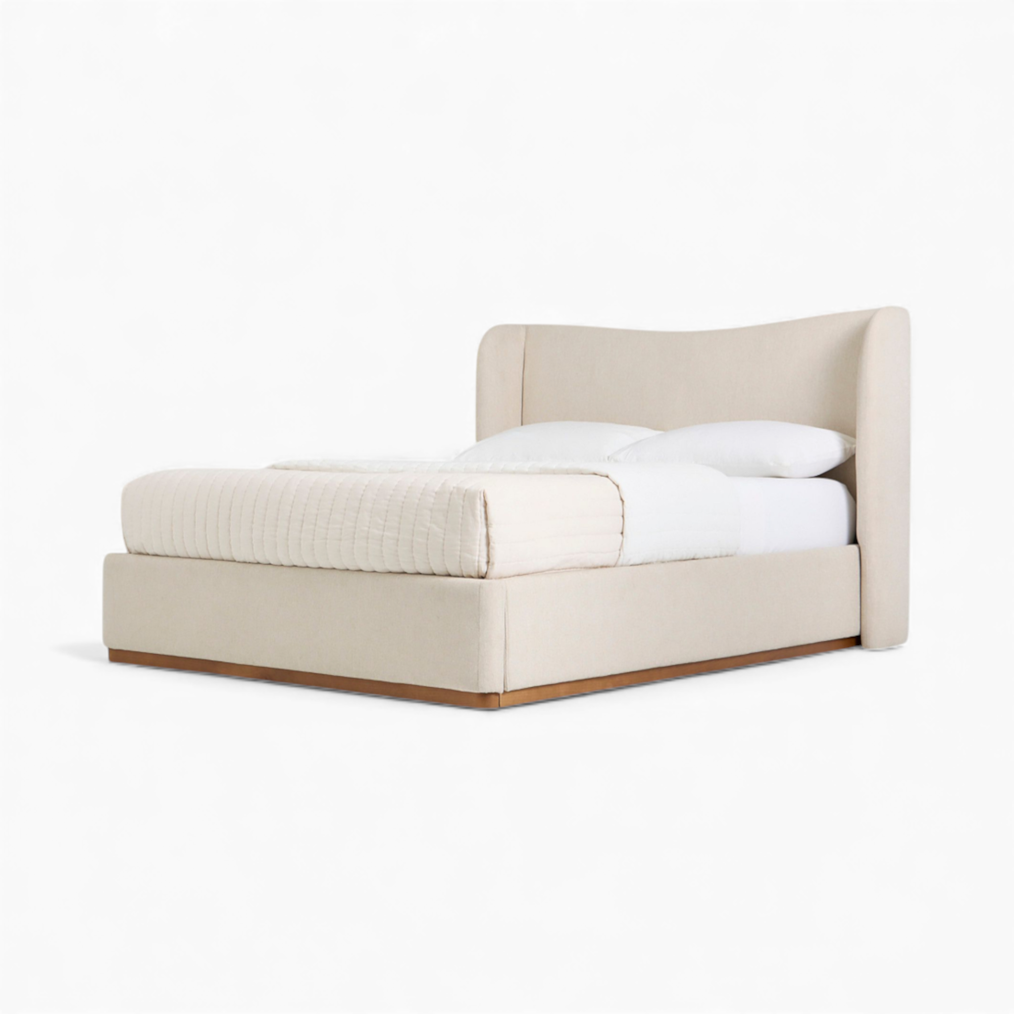 The Calma Bed Frame blends traditional elegance with contemporary comfort. This substantial upholstered platform bed features a striking wingback headboard that gently curves inward, creating a cozy, cocooning atmosphere. Wrapped entirely in a durable, neutral linen-blend fabric (cream/beige), the frame is subtly elevated by a minimal, recessed natural wood plinth base. The Calma is the perfect anchor piece for a transitional or contemporary master bedroom seeking high-end style.