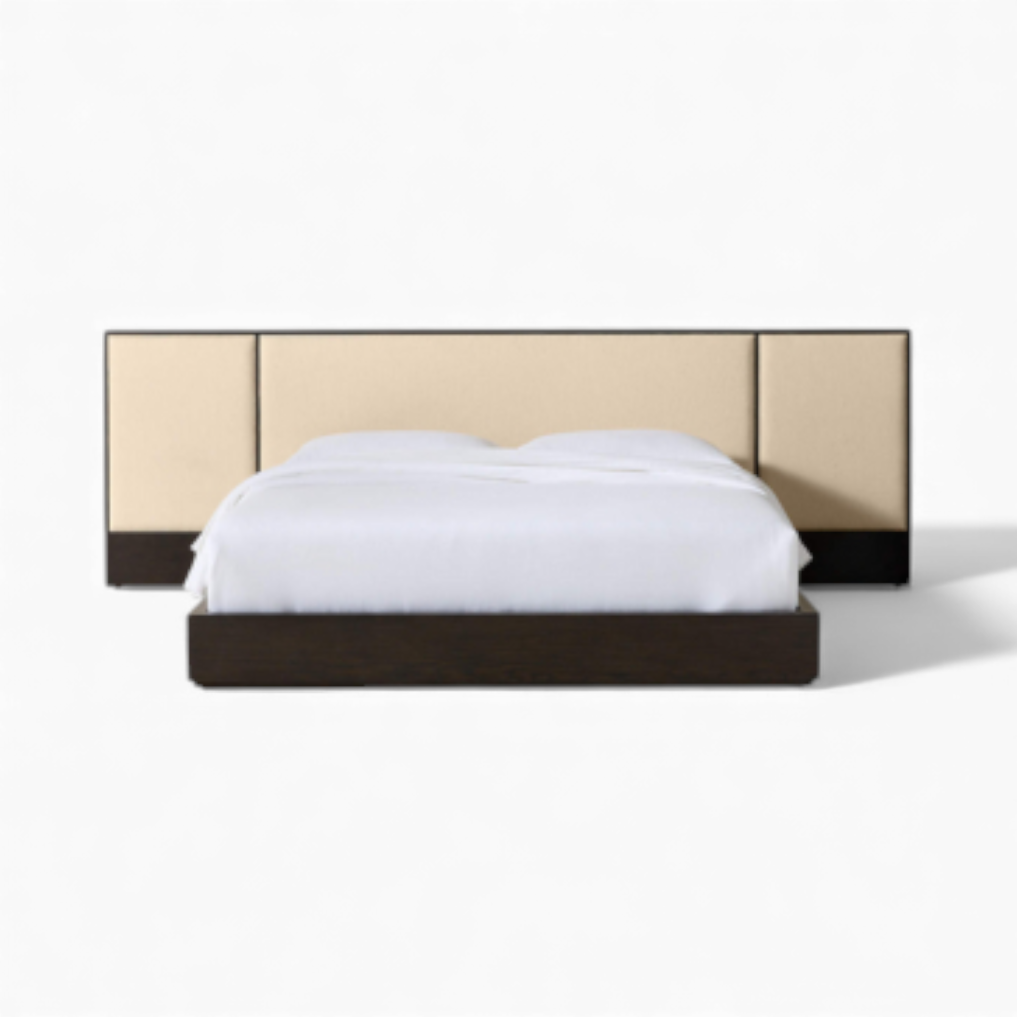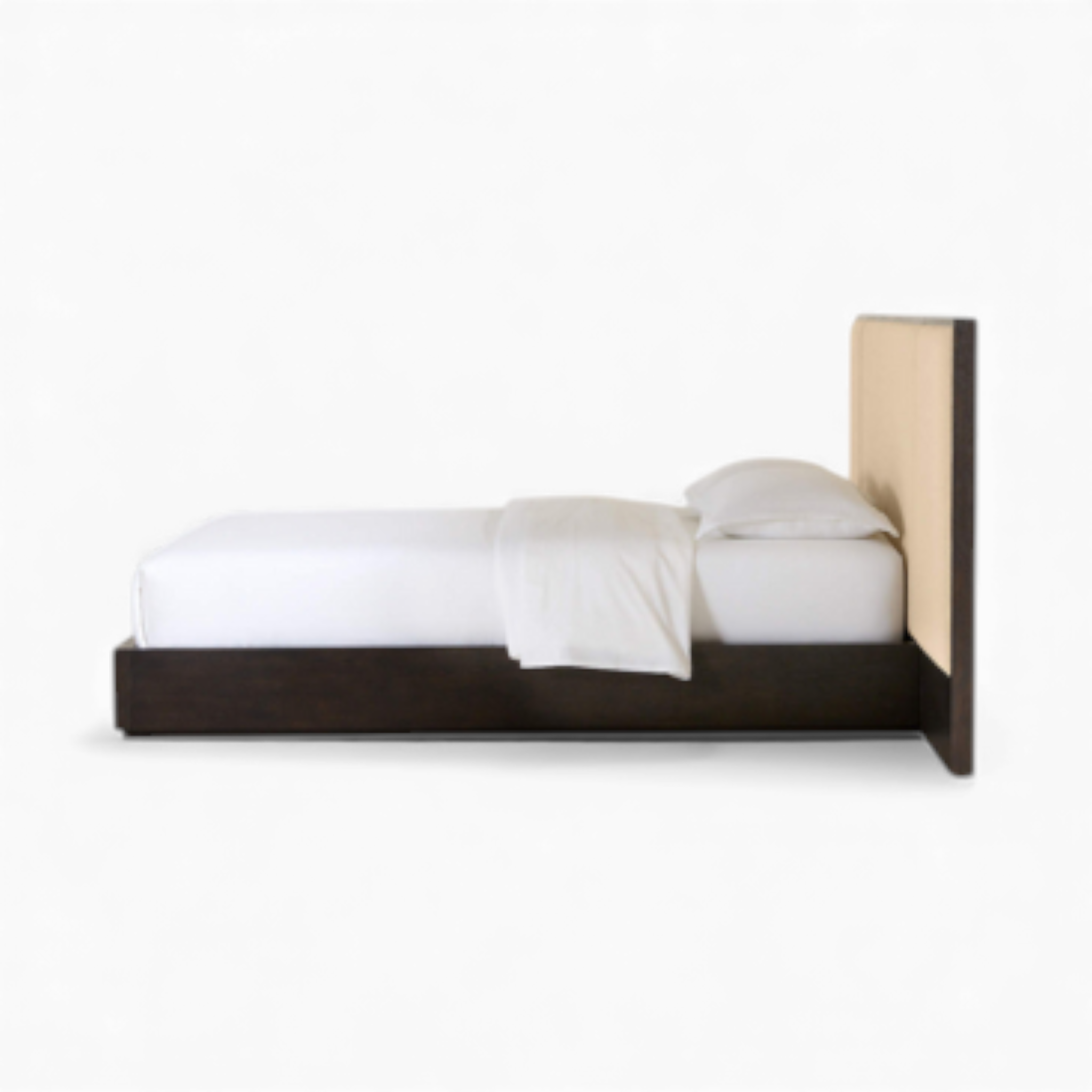 The Dikson Bed Frame is a masterclass in architectural design. This sophisticated low-profile platform bed features a striking, oversized headboard that extends horizontally, acting as a stunning backdrop for your sleep space. The headboard is designed with contrasting panels: rich dark wood and soft neutral upholstery, offering a custom, two-tone aesthetic. Its grounded silhouette and clean lines make the Dikson the ideal choice for an urban contemporary or minimalist master suite.