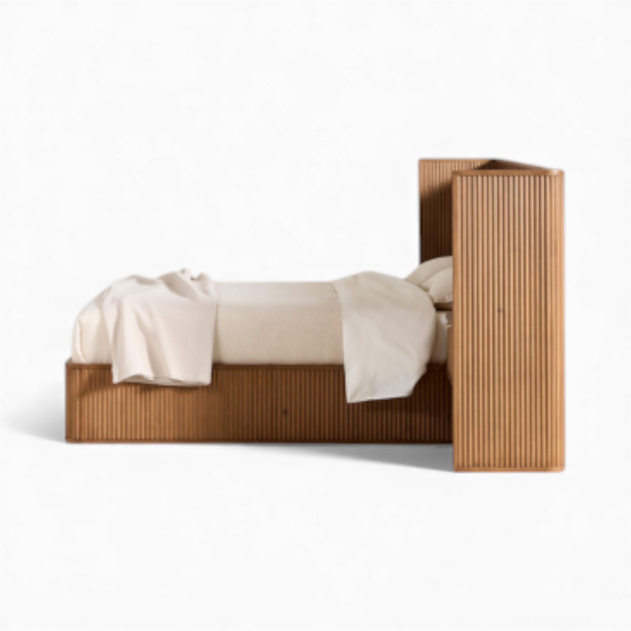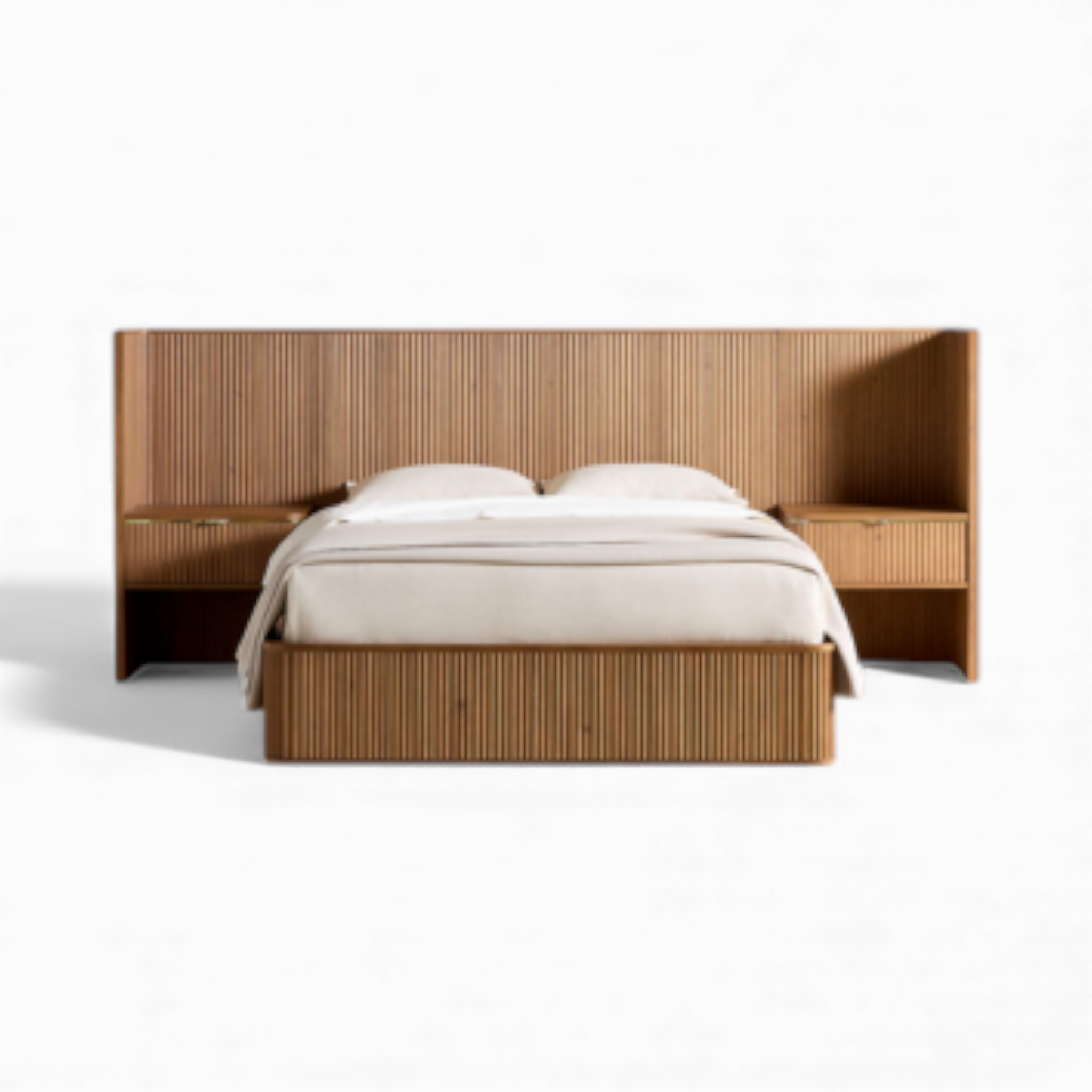 The Rainie Bed Frame is a masterpiece of architectural design and functional elegance. This low-profile platform bed is wrapped entirely in a beautiful natural wood finish featuring a striking vertical reeded texture (or fluting) that adds deep visual interest. The design is seamless, featuring an oversized headboard system that flows directly into integrated nightstands and cabinets. The Rainie is the ultimate Japandi-style piece, providing both organized storage and a tranquil, textural statement.