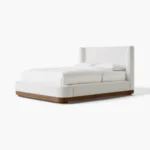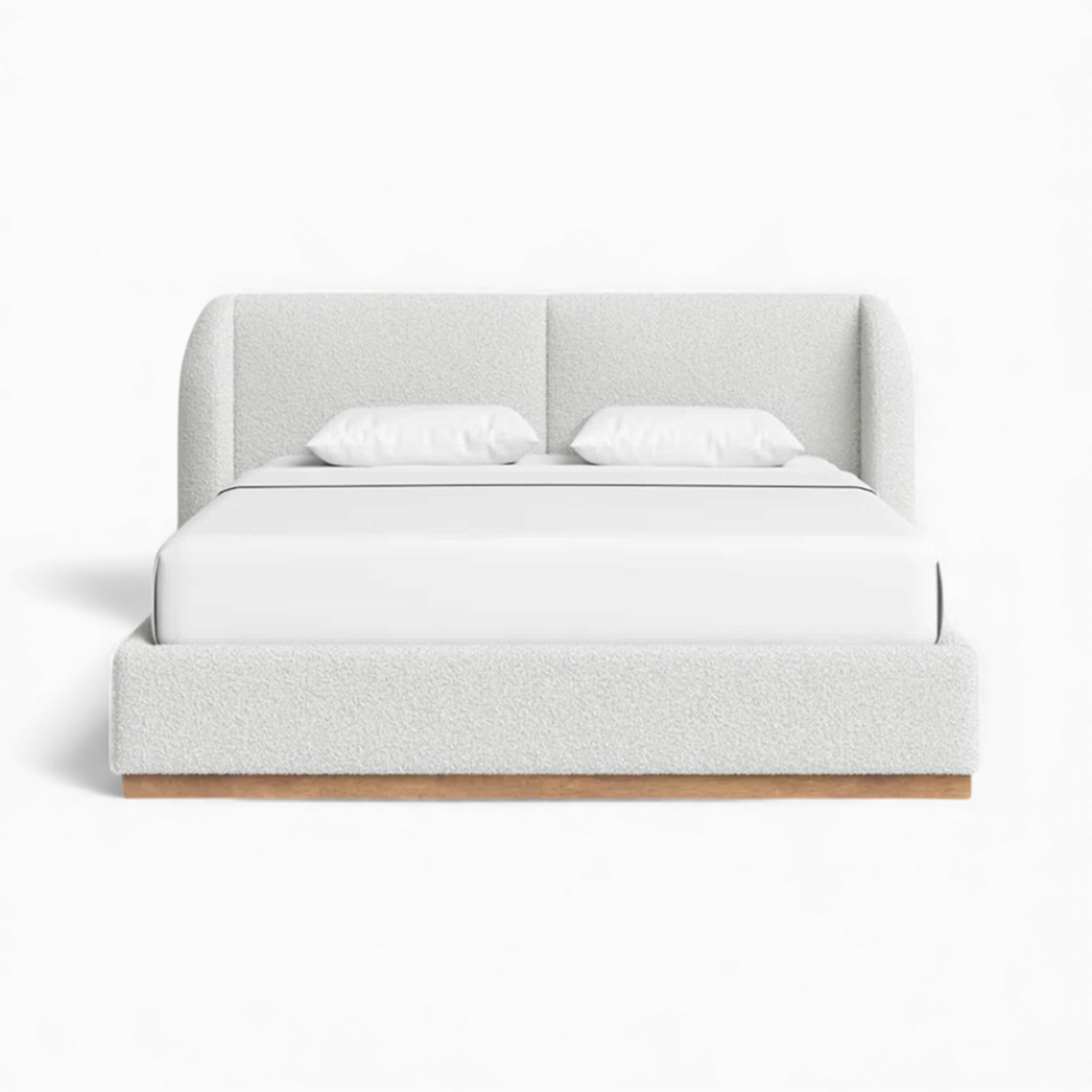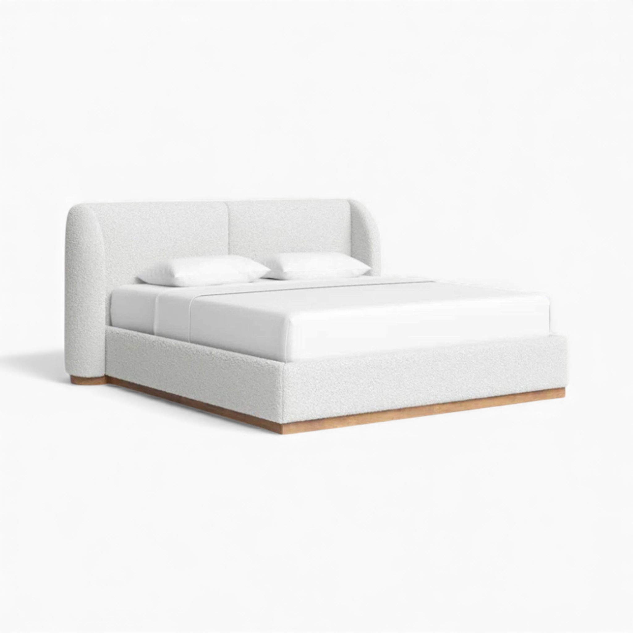 Transform your bedroom into a serene sanctuary with the Aleya Bed Frame. This stunning upholstered platform bed features a plush, white bouclé fabric that adds rich texture and a cloud-like aesthetic to any space. The design is defined by its soft, curved wingback headboard and clean lines, resting elegantly on a warm solid wood plinth base. Perfectly blending Japandi and organic modern styles, the Aleya offers both sturdy support and high-end design.