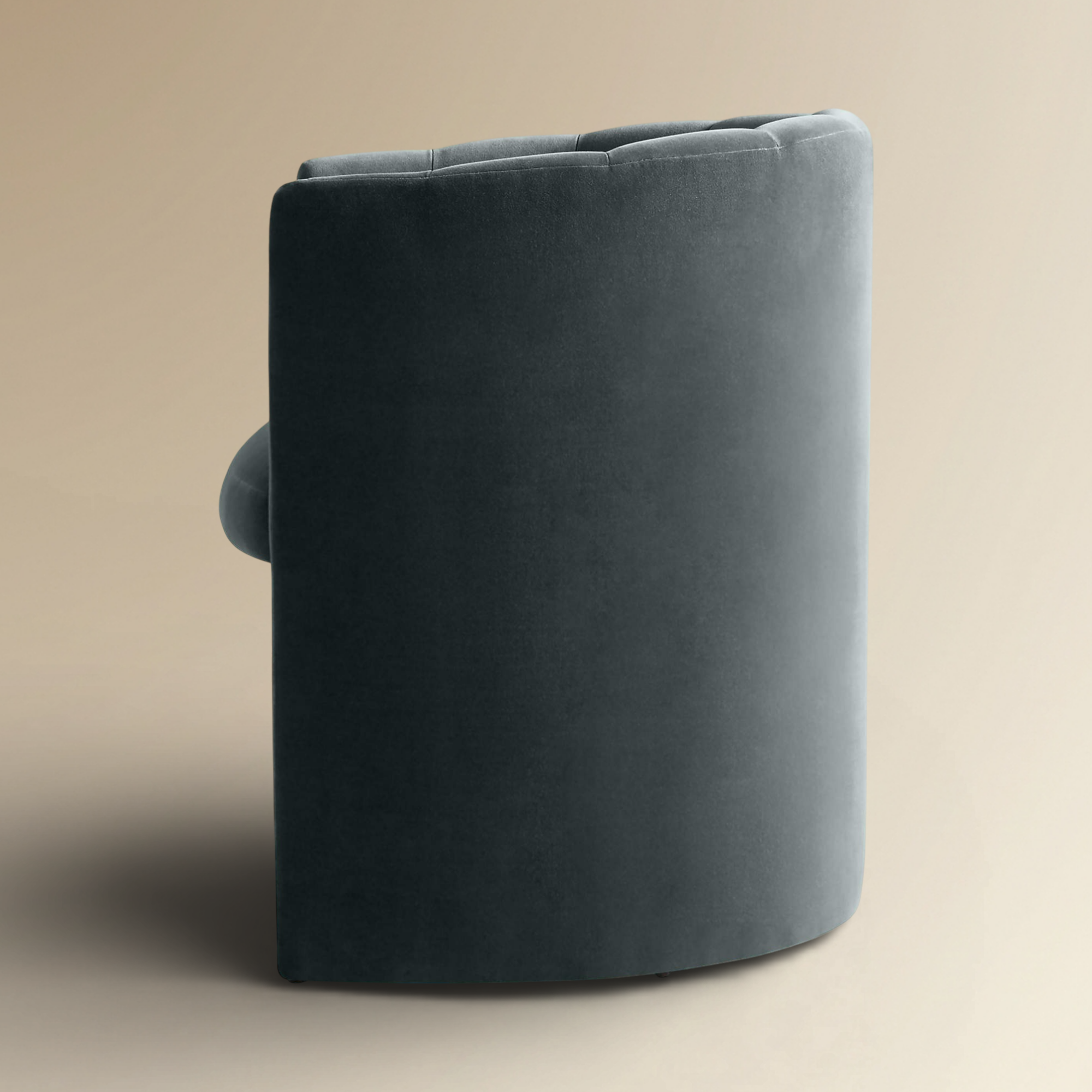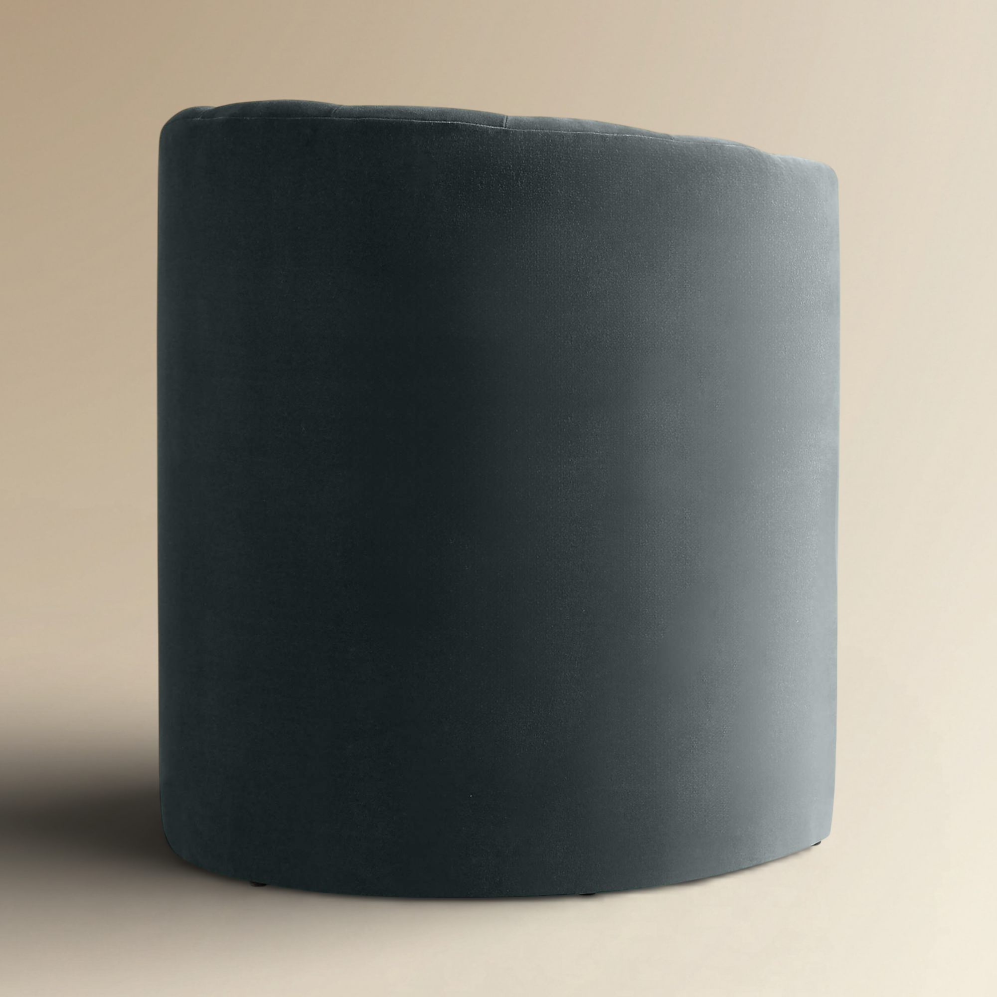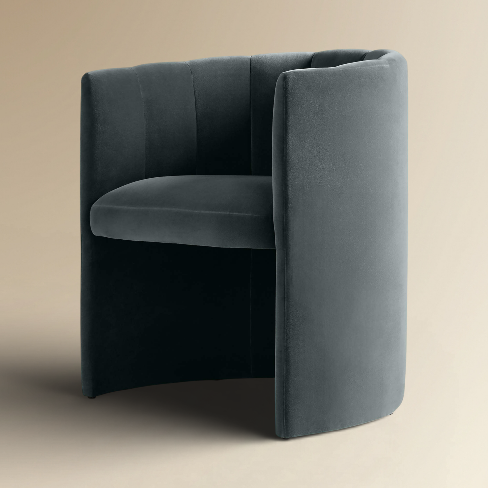 sophisticated fusion of classic texture and modern form. This fully upholstered piece is defined by its substantial, deep barrel-back silhouette, which is meticulously detailed with striking vertical channel tufting. Wrapped in a rich, dark velvet, the chair offers a luxurious tactile finish and a commanding presence. Engineered for enveloping comfort, it serves as an elegant accent for any sophisticated dining or seating area.