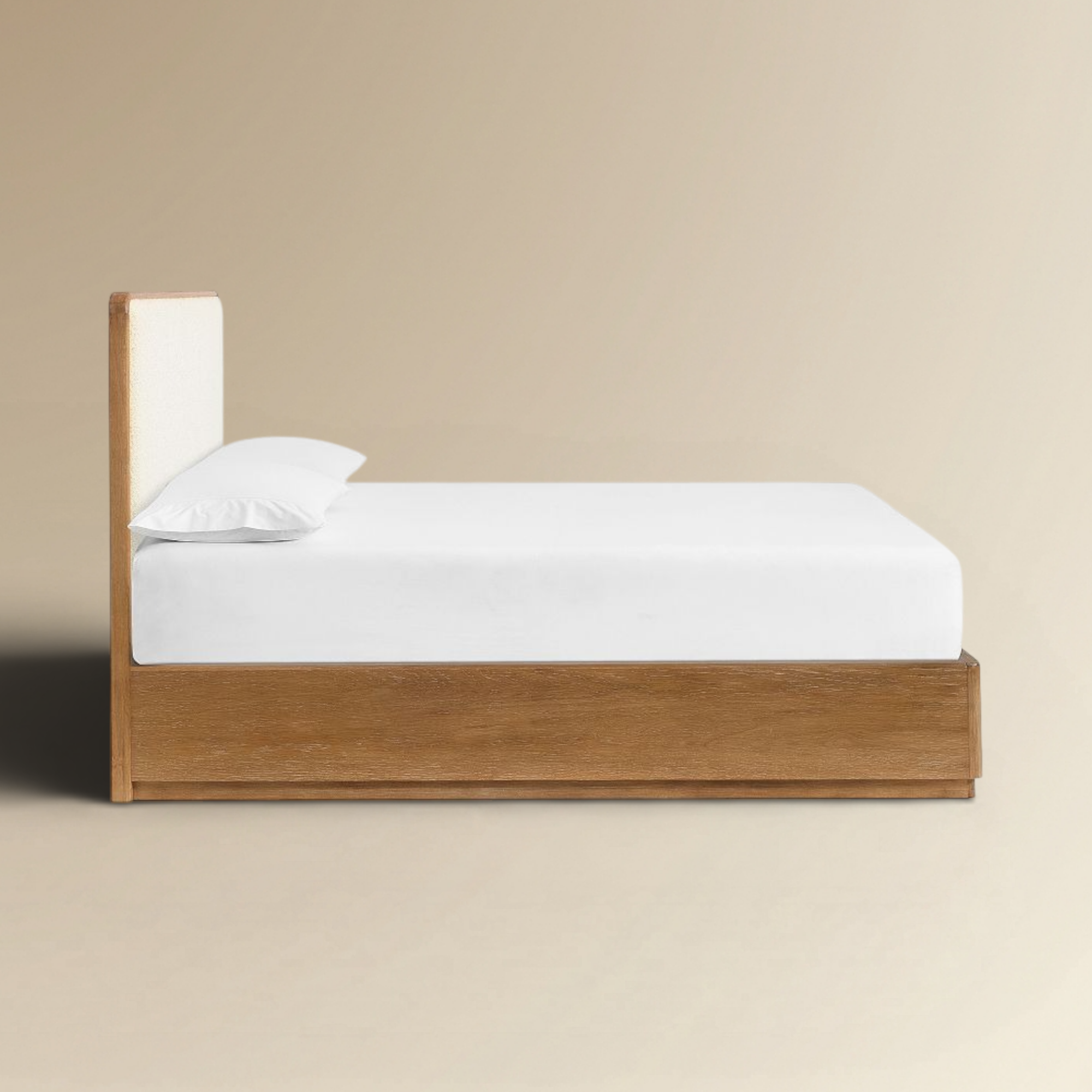The Dillon Bed is a sophisticated fusion of organic warmth and tactile luxury, defining the modern bouclé and wood bed aesthetic. This designer oak platform bed features a high-quality solid wood frame with a rich natural grain, perfectly complemented by a plush cream bouclé upholstered headboard. Engineered for stability and style, this luxury low-profile bed anchors your master suite with a refined, contemporary silhouette that requires no box spring.