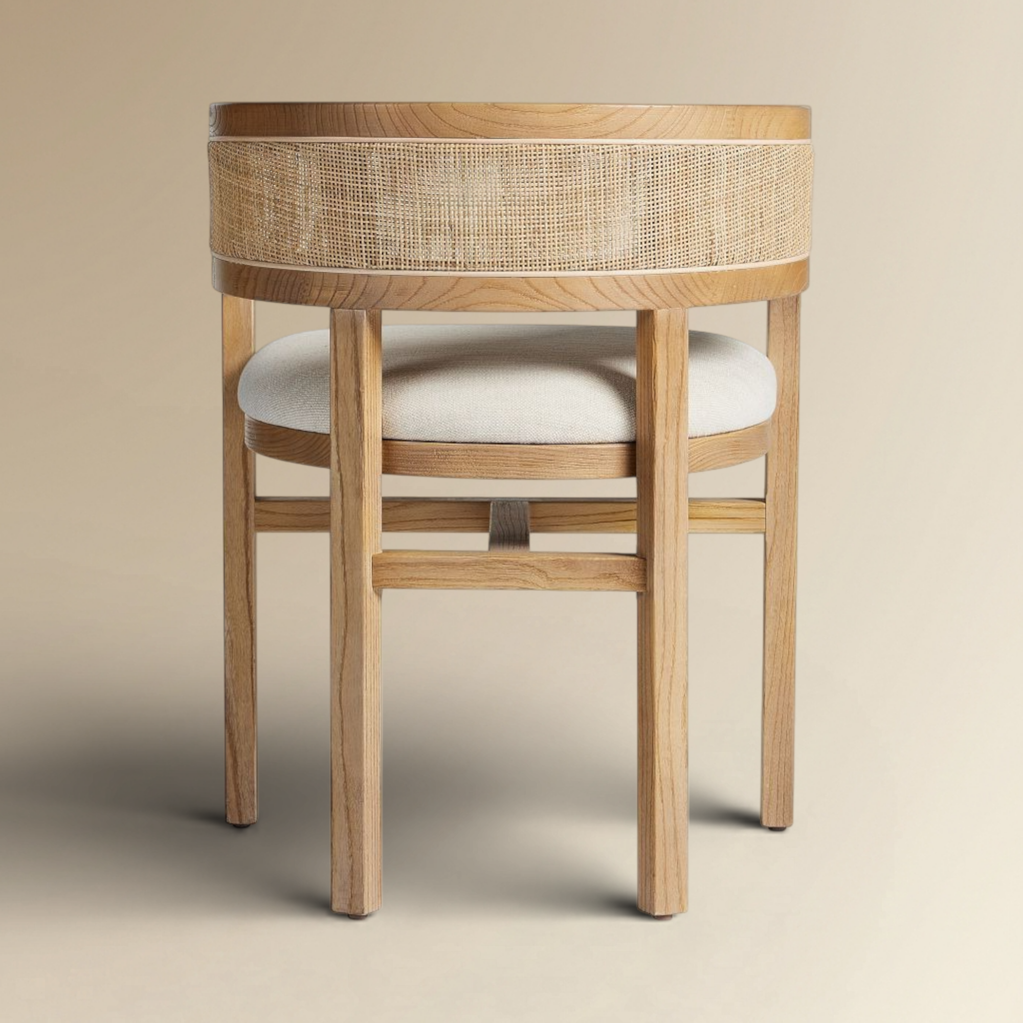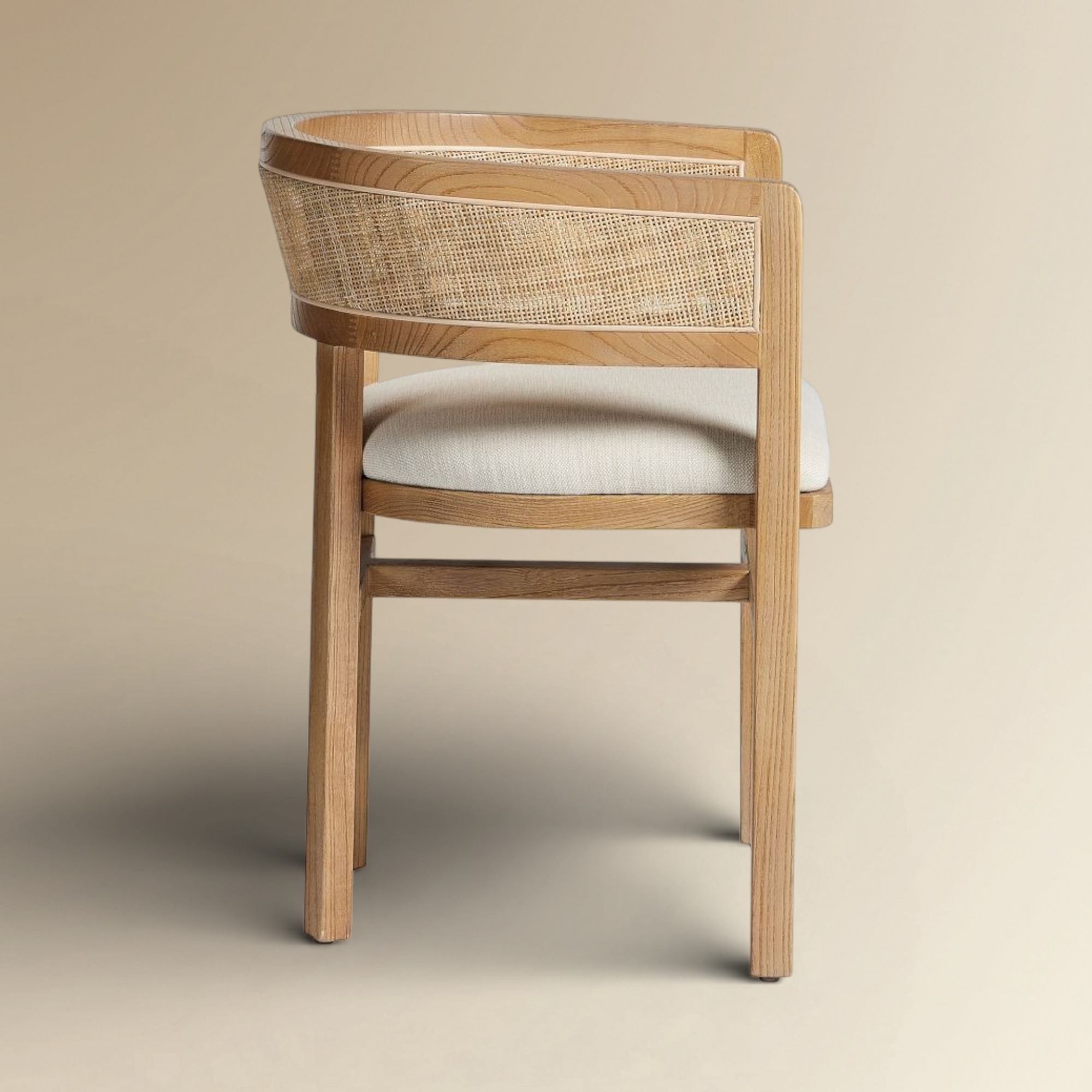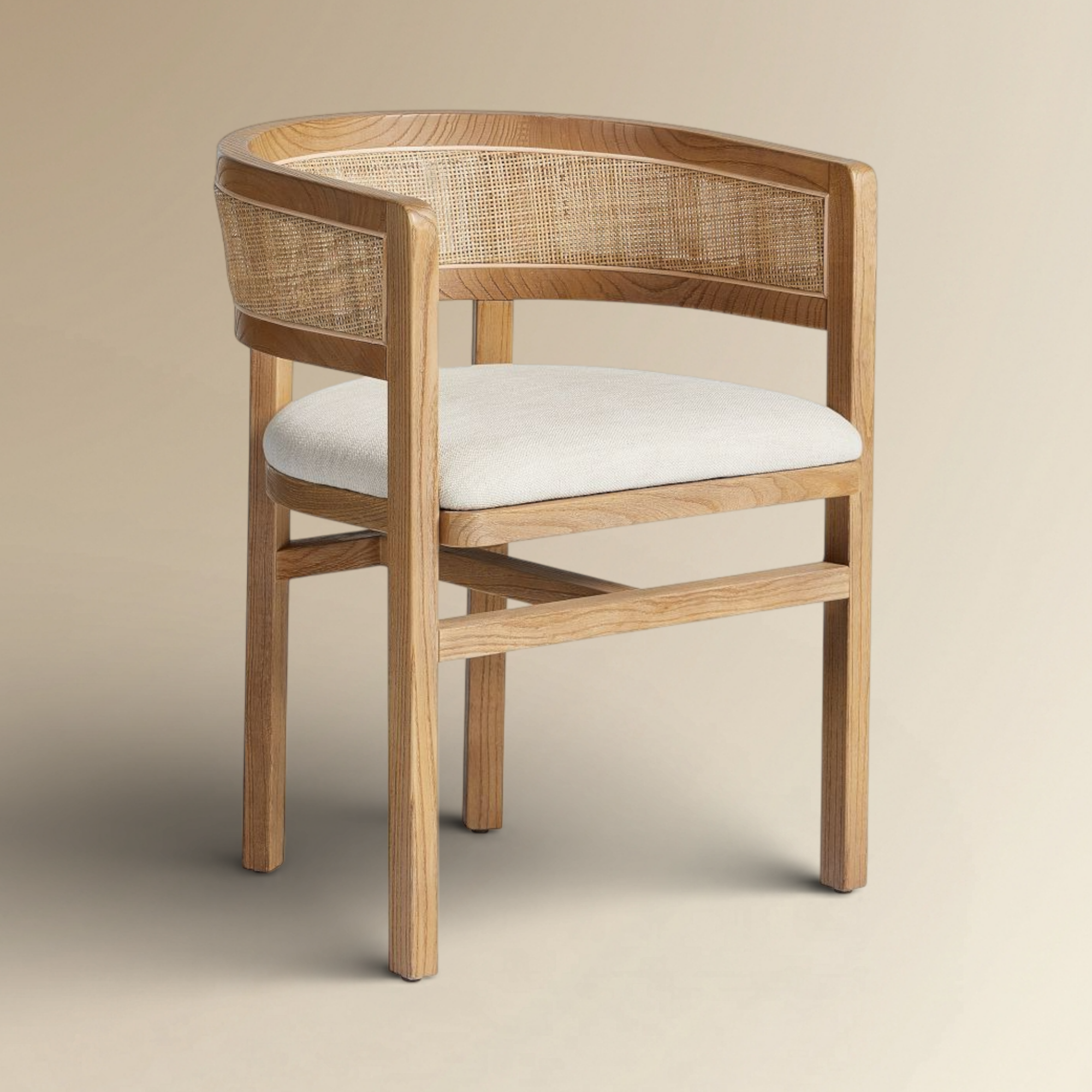 Emiliya Cane and Teak Barrel Chair is a stunning tribute to organic minimalism, featuring a curved, wraparound backrest with intricate natural rattan caning. Crafted from premium solid oak with a visible honey-toned grain, this chair offers a breathable, lightweight aesthetic without compromising on structural strength. Its plush, cream-toned seat provides a soft contrast, making it a quintessential piece for high-end Scandinavian dining rooms or modern coastal interiors.