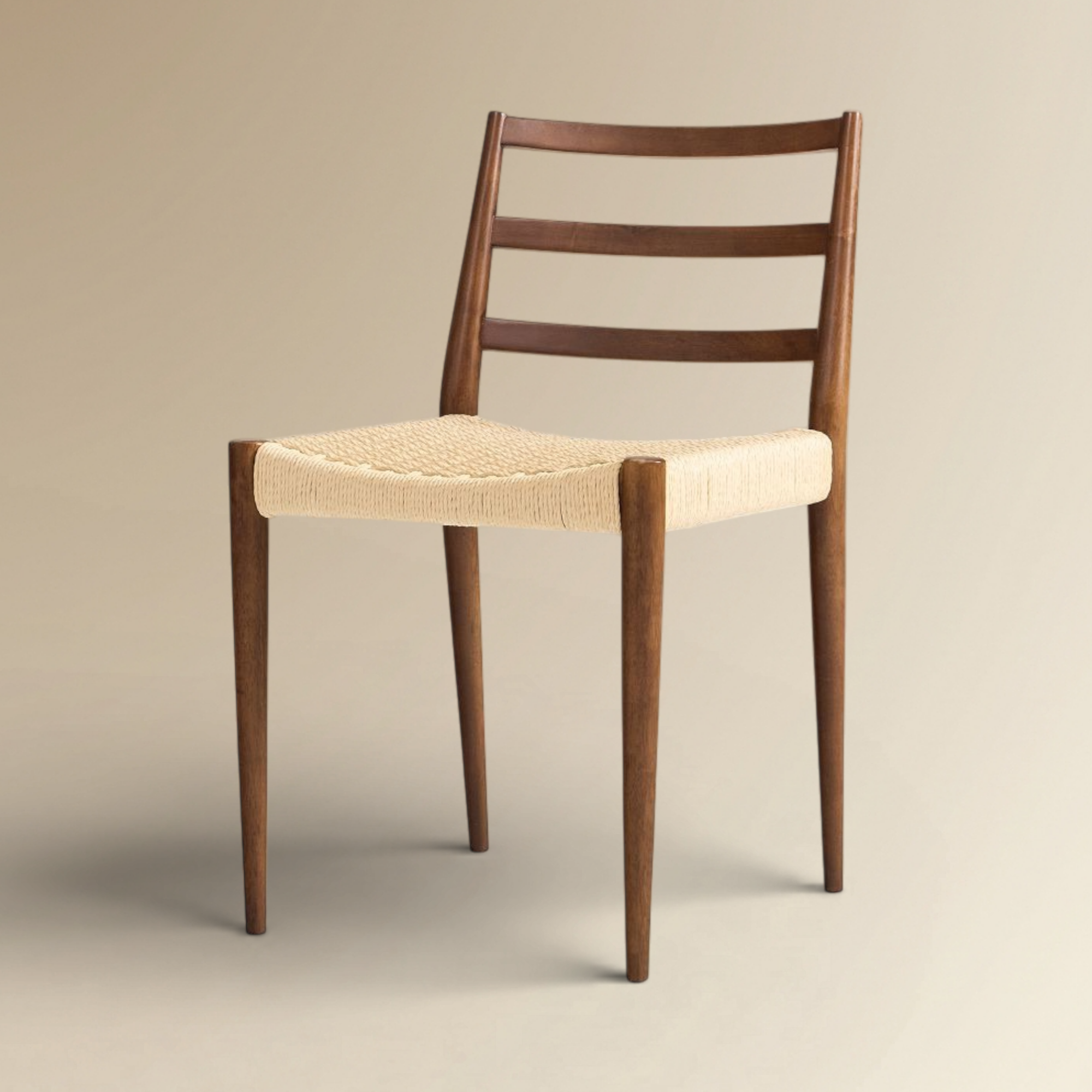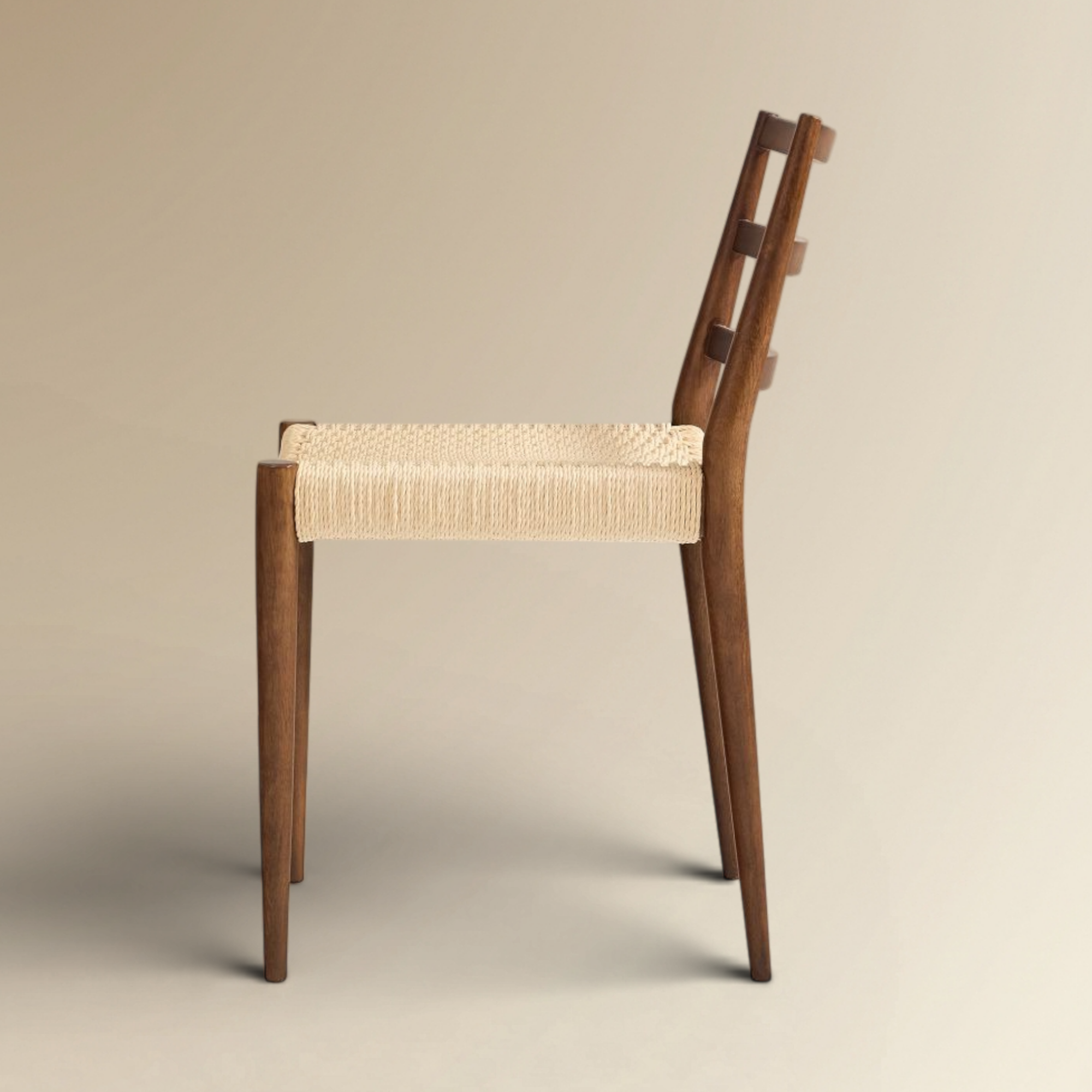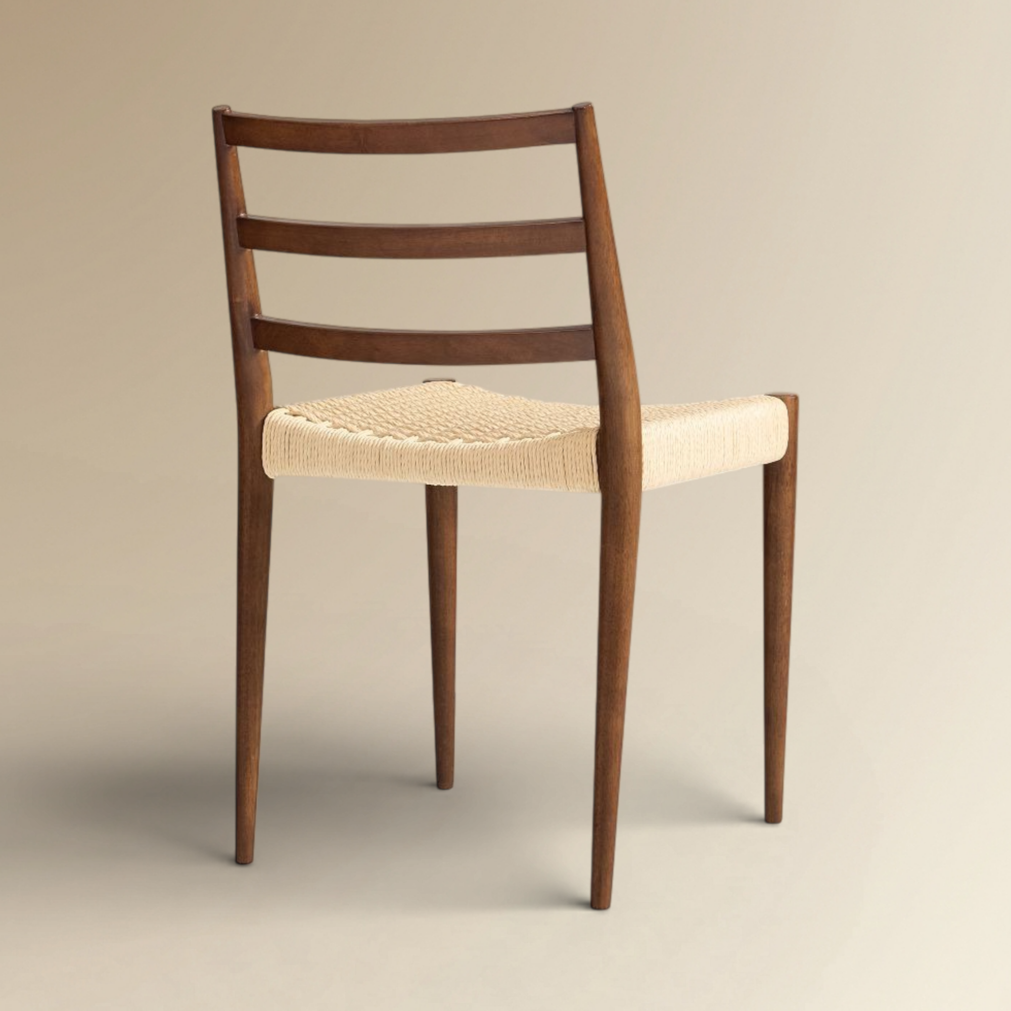 The Gisella Mid-Century Ladderback Chair is a masterful blend of vintage inspiration and modern artisan craft. Featuring a striking solid wood ladderback frame with a warm walnut finish, this chair is defined by its hand-woven natural paper cord seat. Its slender, tapered legs and ergonomic horizontal slats make it an ideal choice for high-end minimalist dining rooms seeking a touch of organic texture and timeless durability.