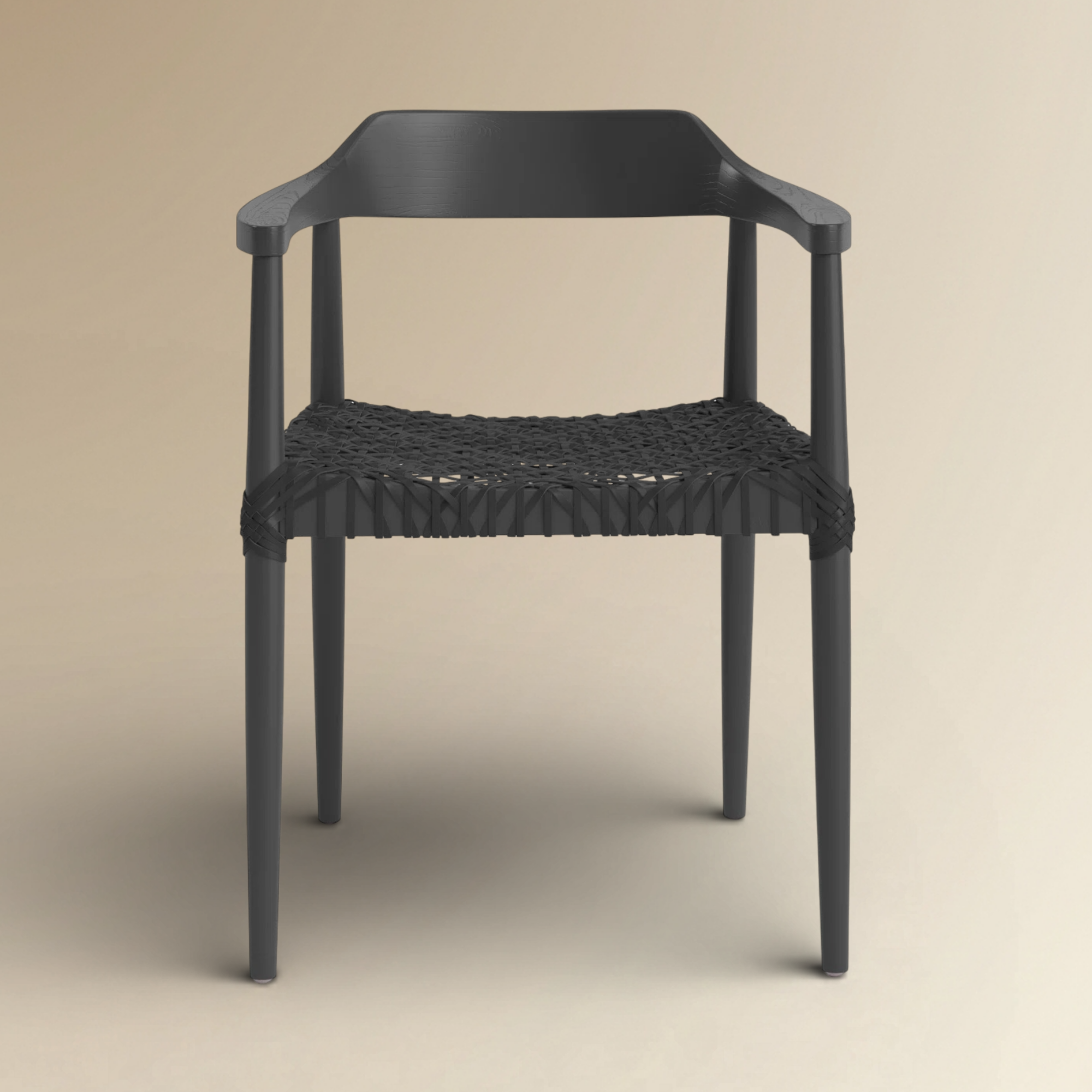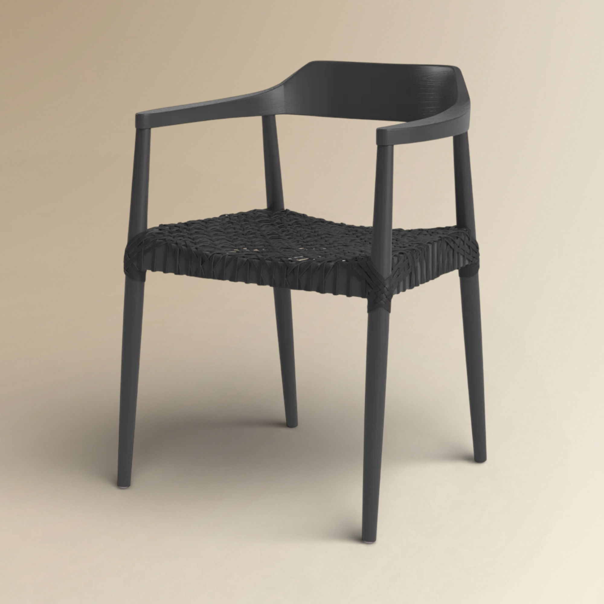 The Hiroshi Dining Armchair is a striking embodiment of Japandi black woven armchair design, featuring an all-black aesthetic that exudes modern sophistication. This designer black wooden armchair is meticulously crafted with a sleek matte frame and a durable, hand-woven seat that provides both texture and breathability. Its architectural wrap-around backrest and tapered legs make it a premier choice for luxury minimalist dining furniture in high-end residential or commercial interiors.