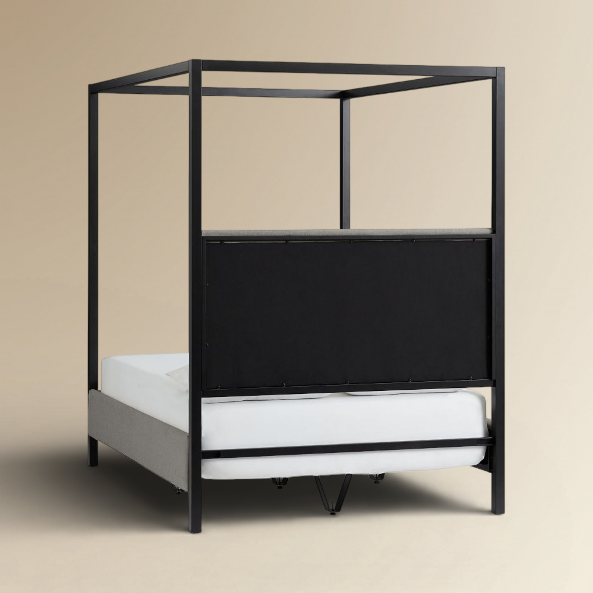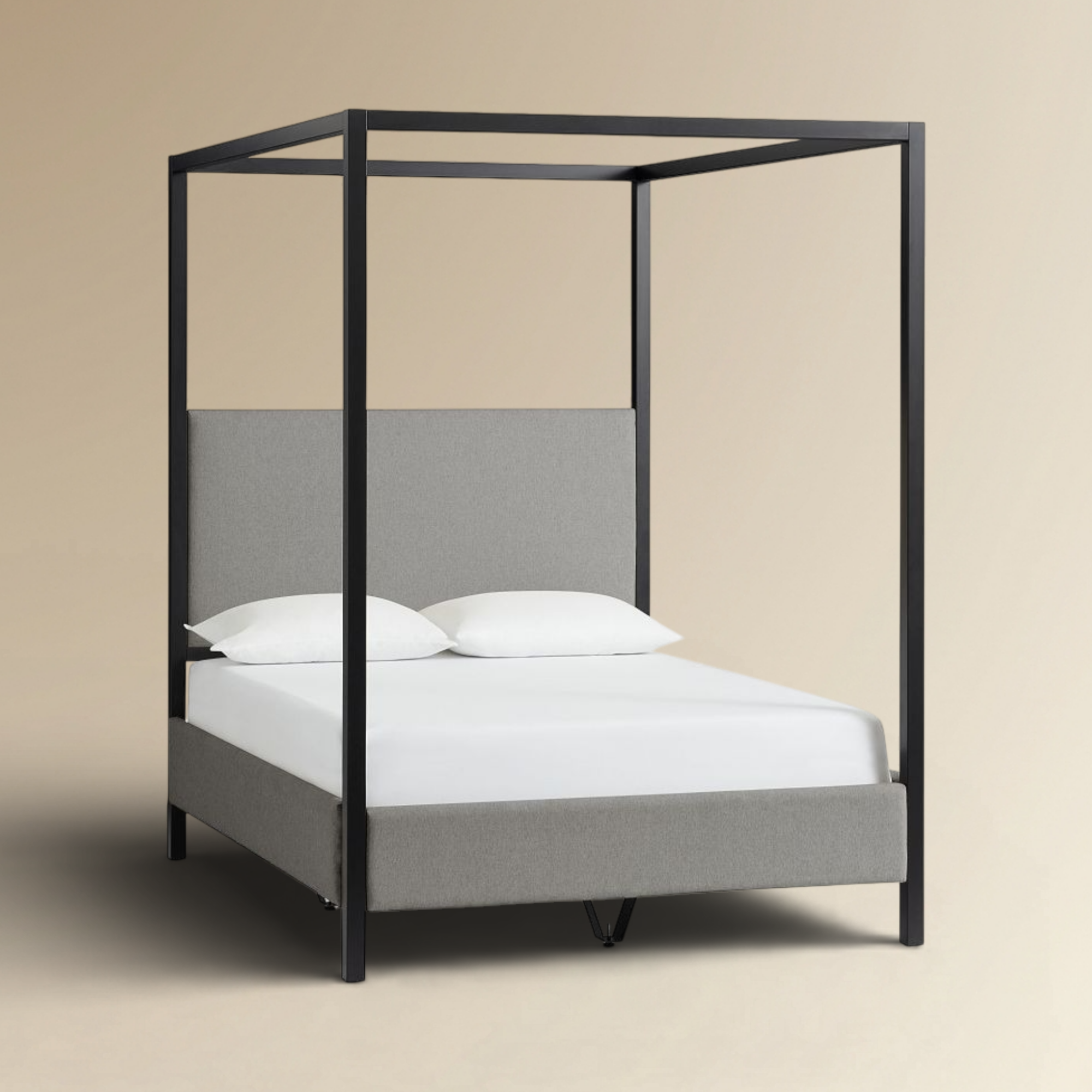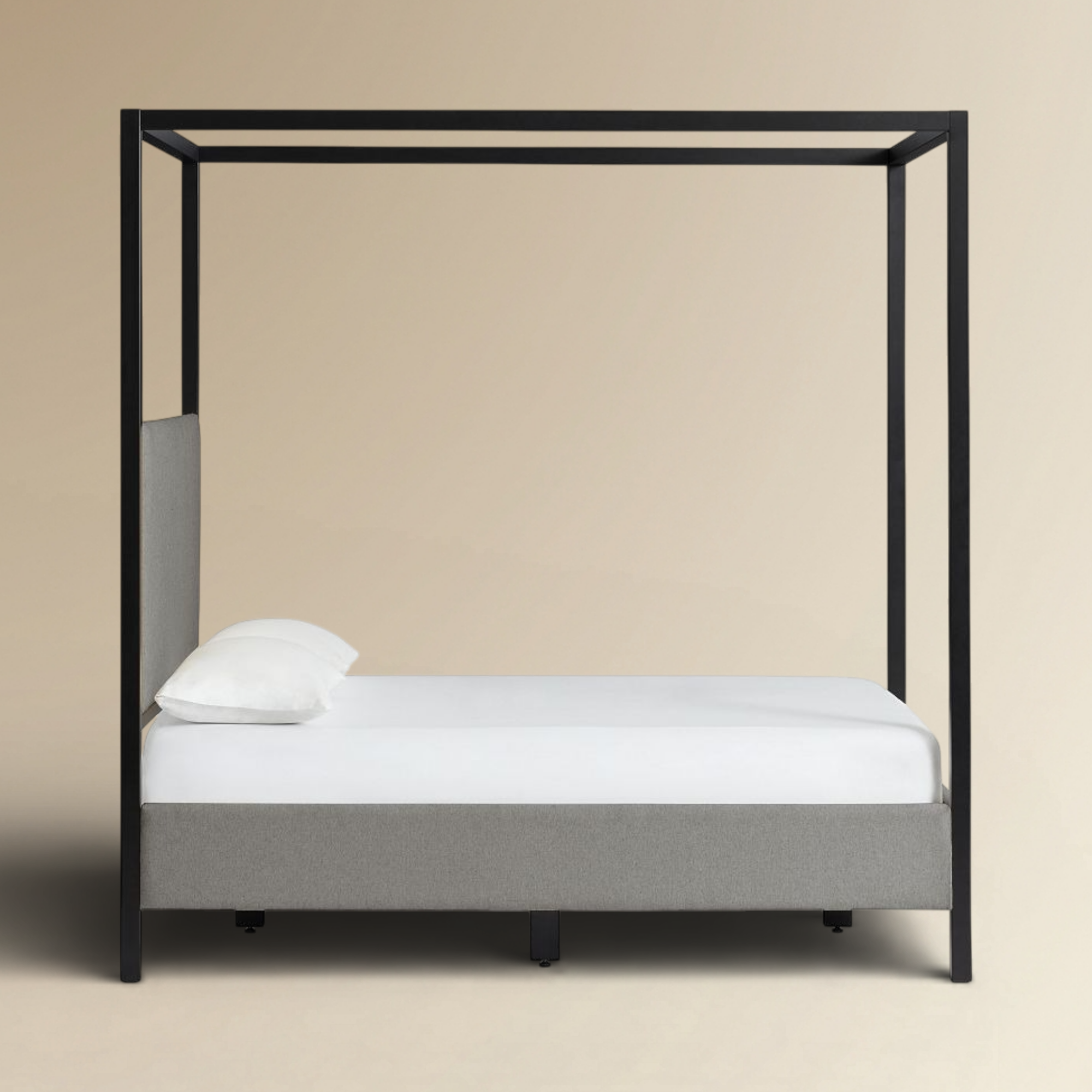 The Josshie Poster Bed is a definitive statement in modern minimalist four poster bed design, featuring a sleek architectural silhouette that defines your sleeping sanctuary. This designer black metal canopy bed is expertly paired with a plush, grey upholstered headboard and base, providing a sophisticated contrast of industrial structure and soft comfort. Engineered for durability and high-end aesthetic appeal, it serves as a luxury upholstered poster bed that anchors contemporary master suites with effortless elegance.