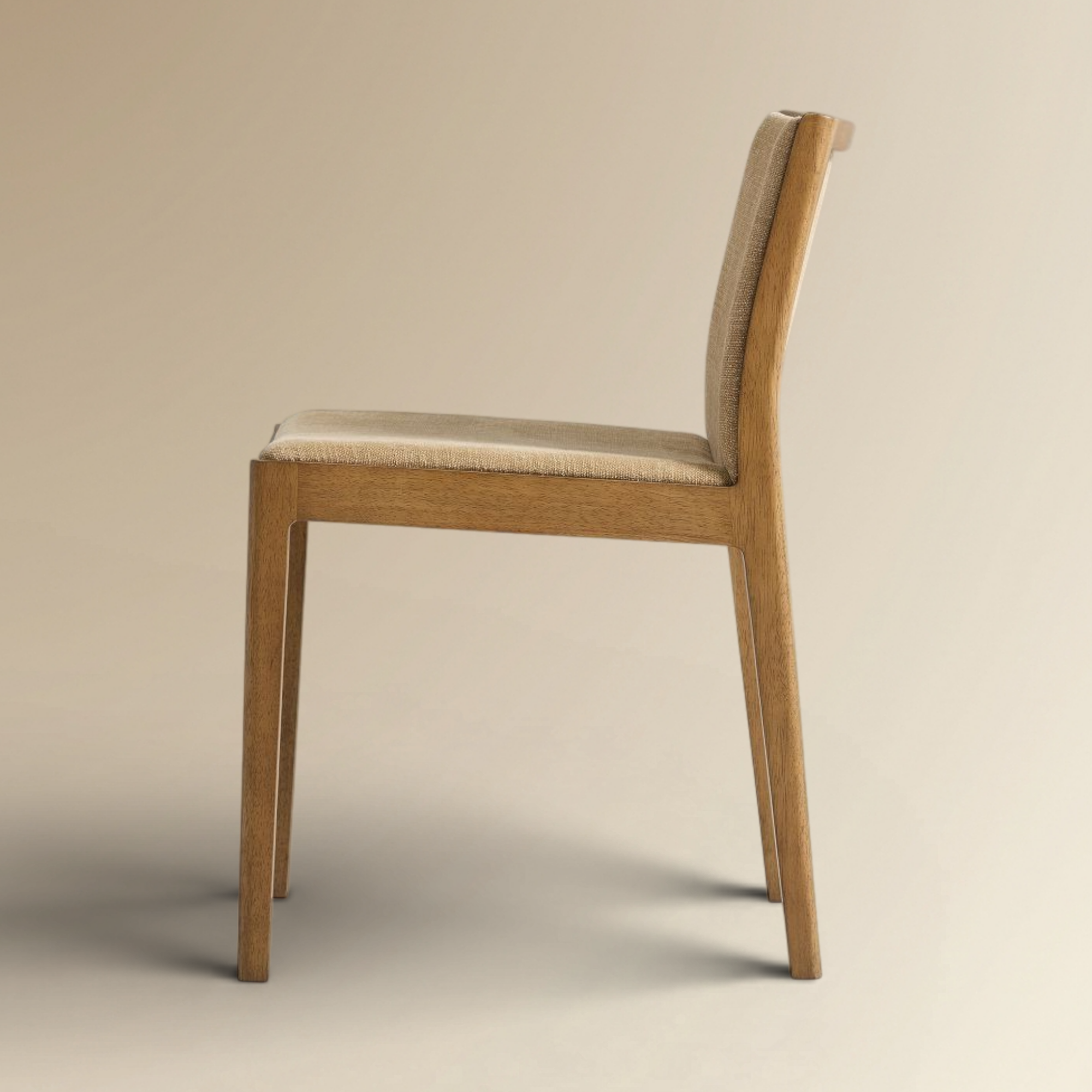 The Lewwis Minimalist Teak Dining Chair is a study in understated elegance, featuring a seamless solid wood frame with a warm, honey-toned finish. Designed with a clean, continuous silhouette, this modern fabric dining chair is upholstered in a premium sand-colored linen weave that offers both breathability and a soft tactile experience. Its lightweight yet sturdy construction makes it an ideal choice for contemporary dining furniture collections that prioritize space-saving design and high-end durability.