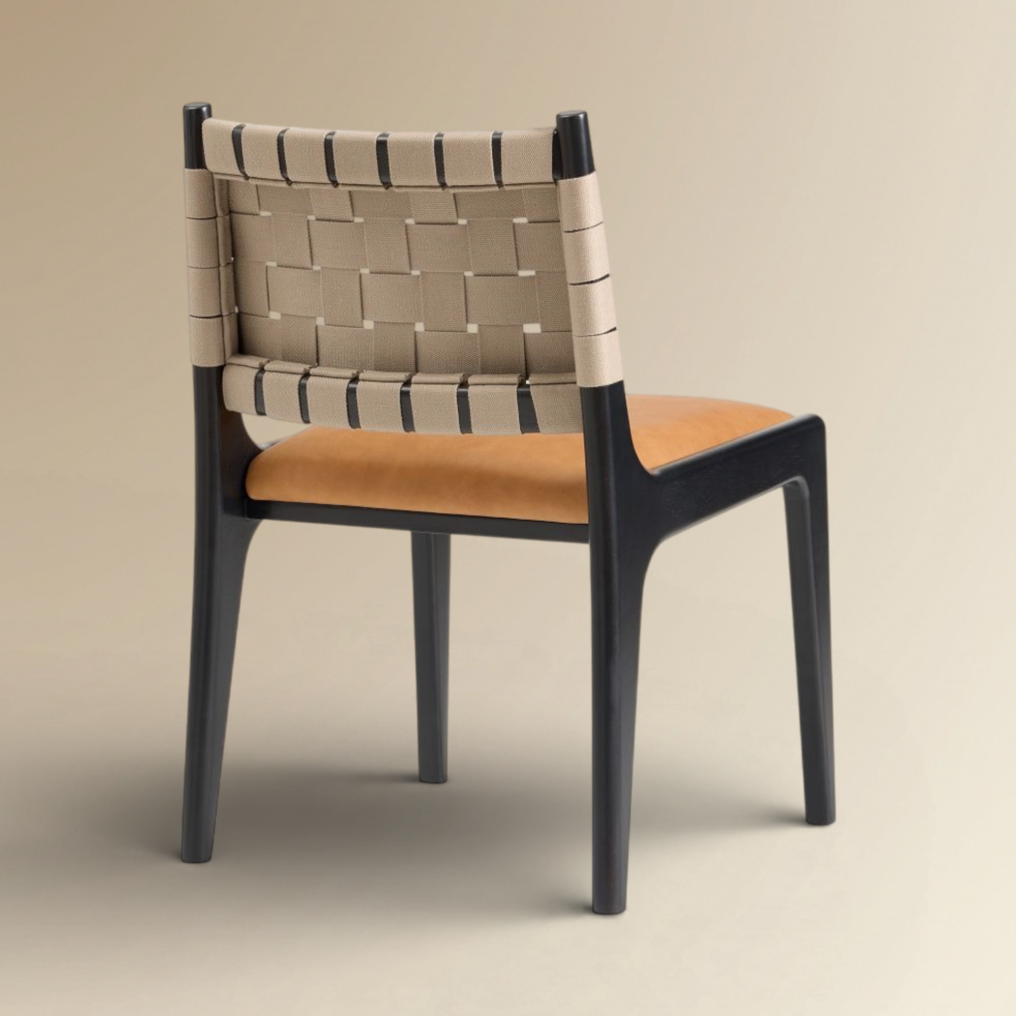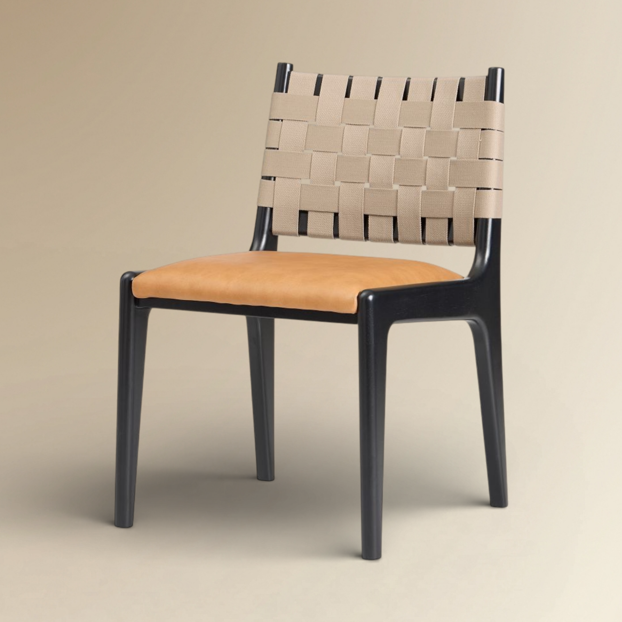 Lula Woven Leather Dining Chair is a masterpiece of contemporary craftsmanship, featuring an intricate hand-woven strap backrest in a soft sand tone. Set against a sleek, matte black solid wood frame, this chair offers a striking visual contrast paired with a premium tan leather seat for unparalleled comfort. Its fusion of organic textures and architectural precision makes it a standout choice for high-end modern or industrial-inspired dining spaces.
