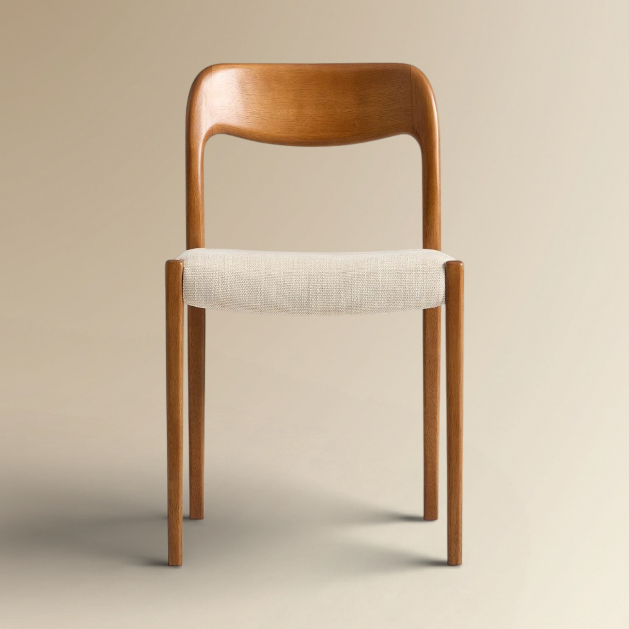 The Naomi Mid-Century Modern Dining Chair captures the essence of Scandinavian minimalism with its fluid, organic silhouette and warm wood tones. Expertly crafted from solid walnut-finished timber, this chair features a gracefully curved backrest that flows seamlessly into slender, tapered legs. Paired with a premium linen-upholstered seat in a neutral oatmeal hue, it offers a sophisticated and durable seating solution for high-end dining environments.
