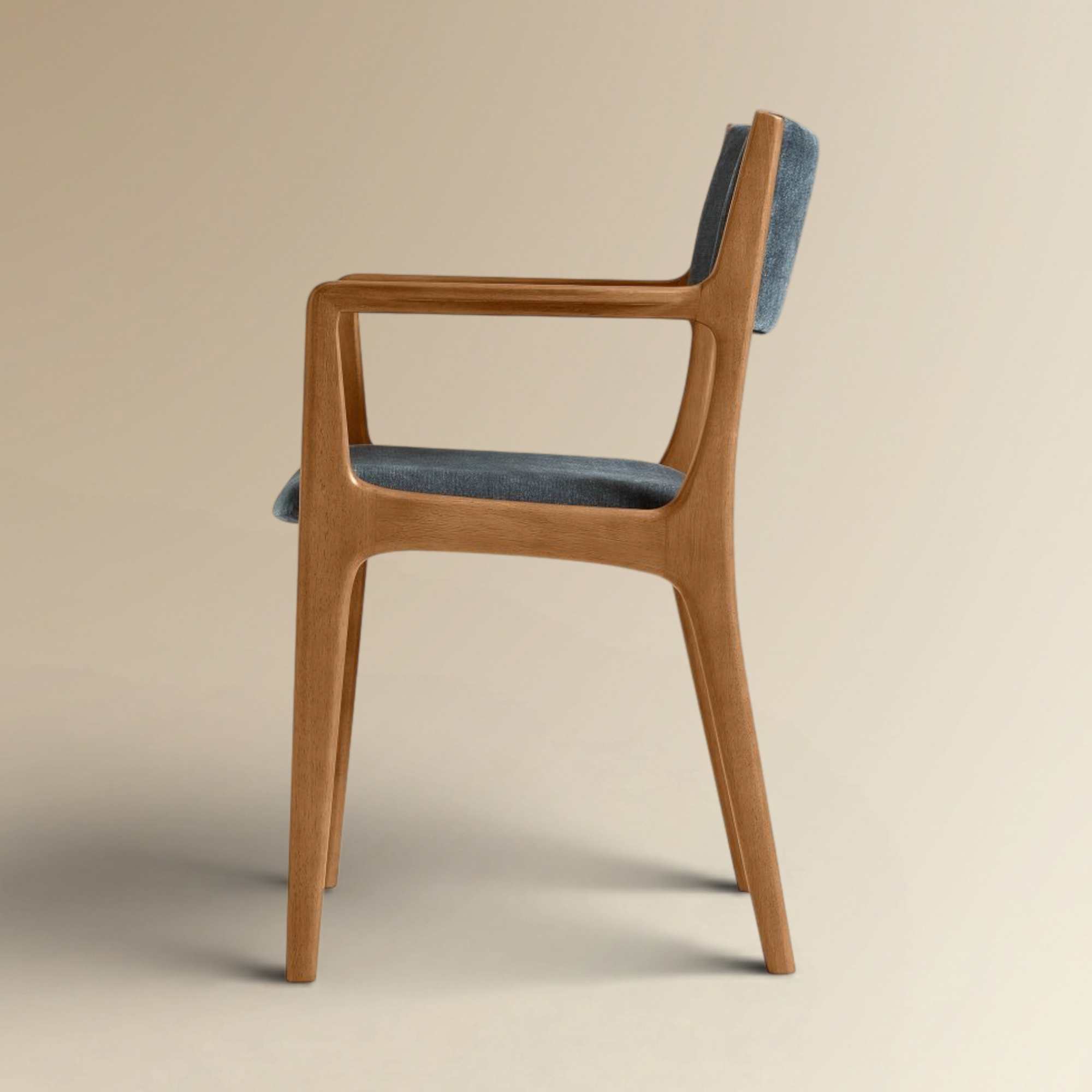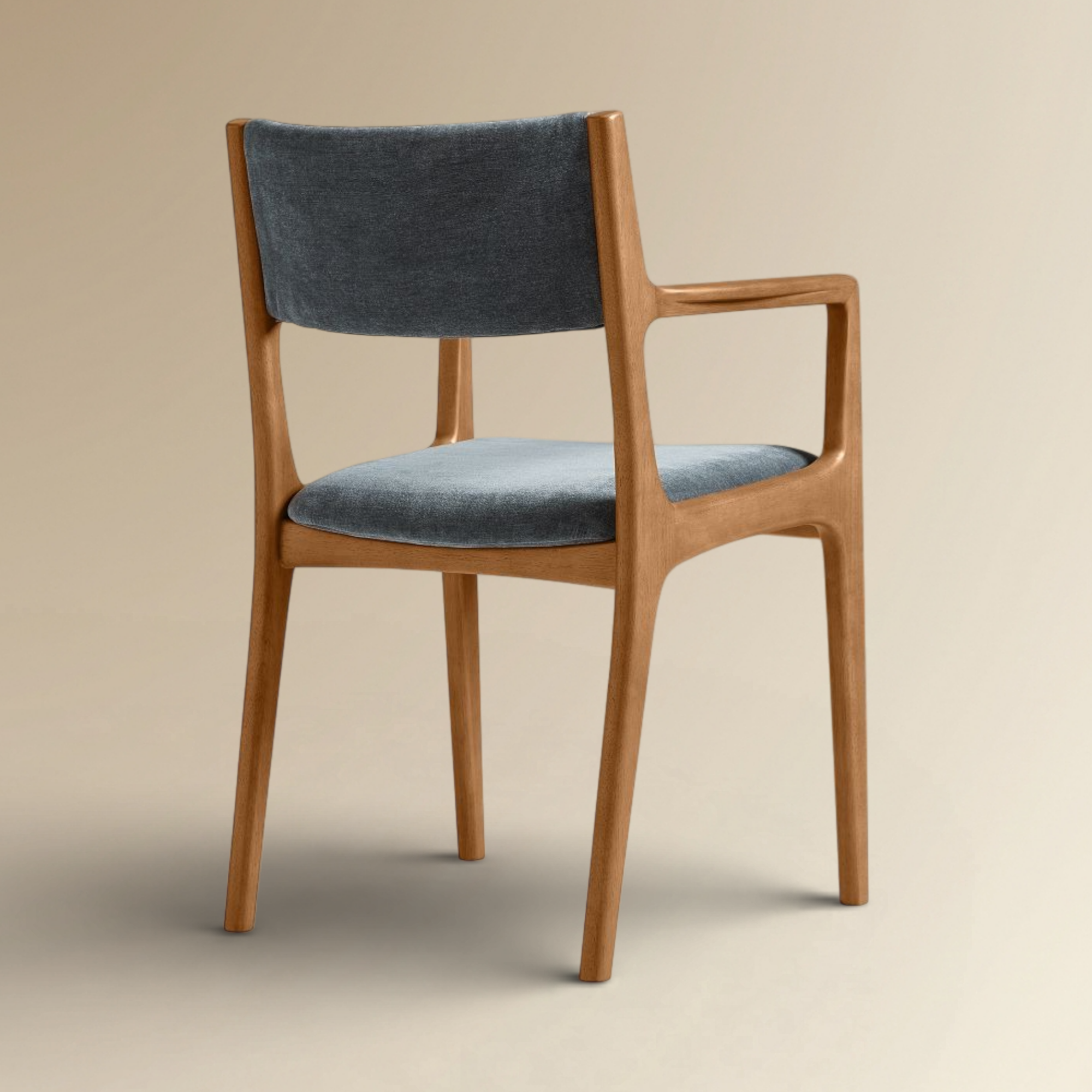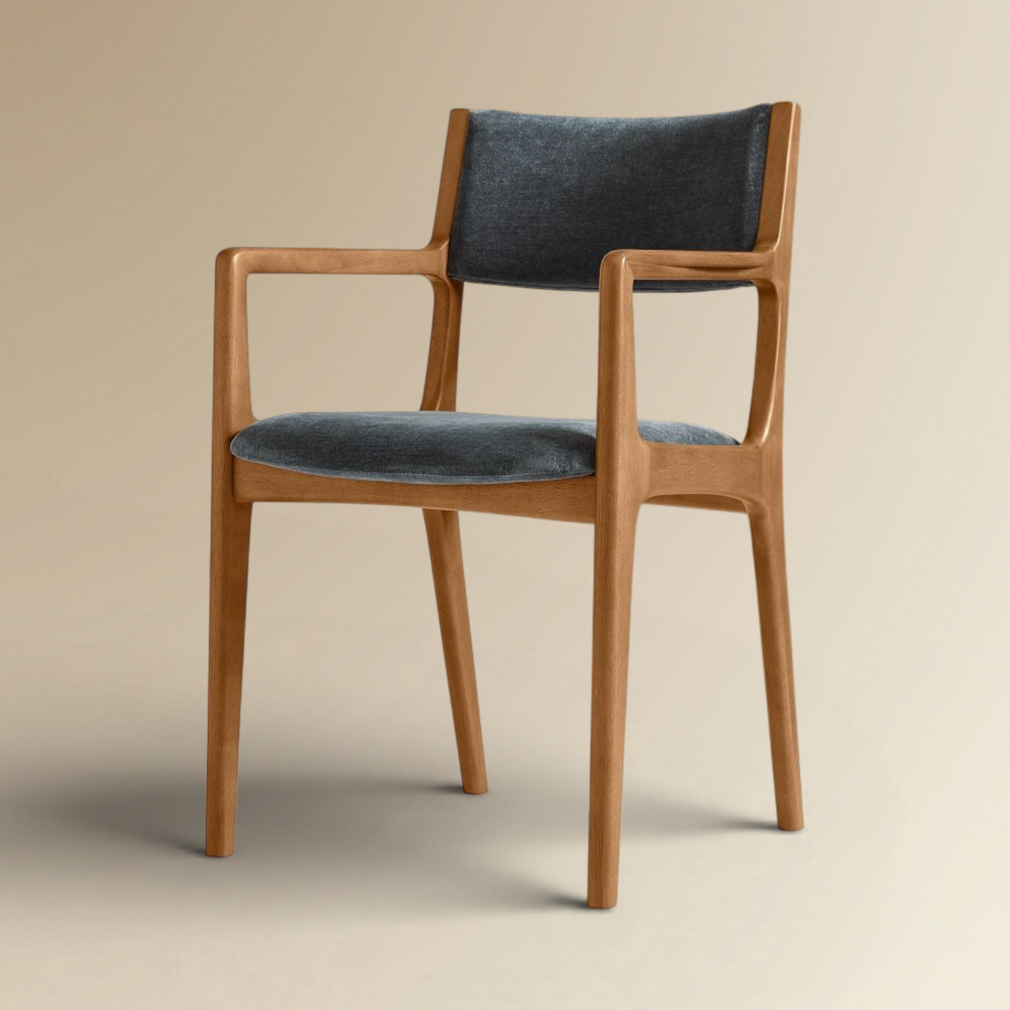 Prestone Modern Walnut Dining Armchair is a sophisticated evolution of classic mid-century design, featuring integrated wooden armrests for enhanced ergonomic support. Crafted with a rich solid walnut-finished frame and premium slate-grey upholstery, this chair brings a refined architectural presence to any upscale dining room. Its seamless joinery and high-performance fabric seat ensure a perfect balance of elite aesthetics and long-term durability.