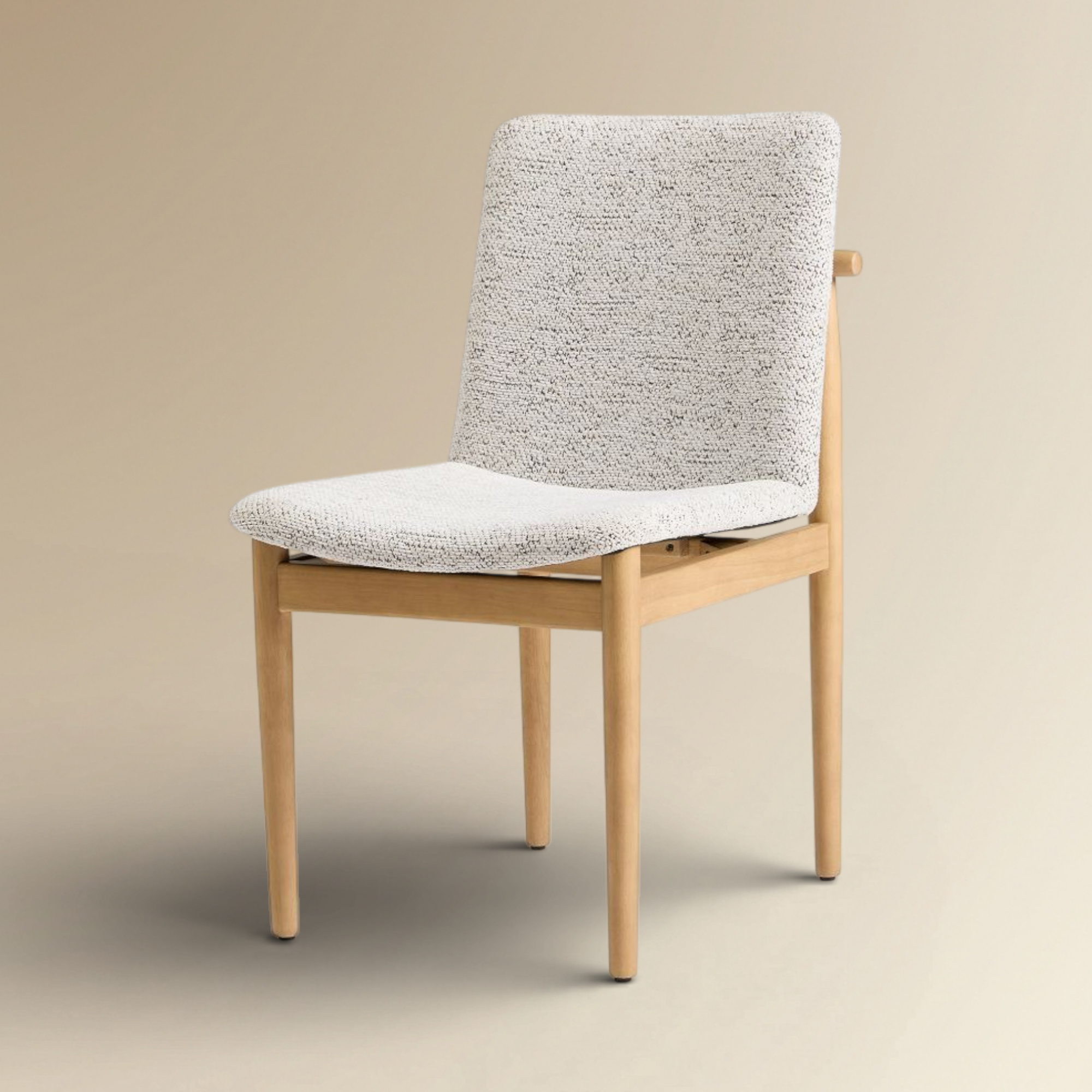 Serena Modern Bouclé Dining Chair is a masterpiece of soft minimalism, featuring a seamless, high-back silhouette upholstered in a premium white textured bouclé fabric. Supported by a handcrafted solid blonde wood frame, this chair offers a bright, organic aesthetic that perfectly complements Scandinavian and Japandi-style interiors. Its gentle contours and high-resiliency cushioning provide an elite level of comfort, making it a sophisticated choice for contemporary luxury dining spaces.